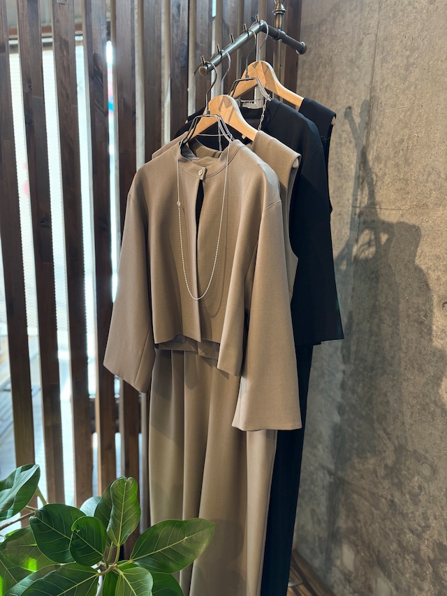 ジャケットとコンビネゾンのセットアイテムです。 ショート丈のスタンドジャケットはスタンドカラーで少しマニッシュな印象にしつつ、後に大胆にいれたスリットで抜け感をプラス。 コンビネゾンは少しウエストの切り替えを上側に設定し、ショート丈のジャケットと合わせることでスタイルアップ効果を持たせました。 単体でもそれぞれ着用もでき、コンビネゾンはオールシーズン着用できる着回し抜群なアイテムになっています。 ジャケット 着丈:45cm 身幅(半身):50cm 肩幅:44cm 袖丈:44cm コンビネゾン 着丈:139cm 身幅(半身):48cm 肩幅:38cm ウエスト:ぐるり82cm ヒップ:ぐるり109cm 股下:62cm 【素材】 [表地] ポリエステル:95% / ポリウレタン:5% [裏地] ポリエステル:100%