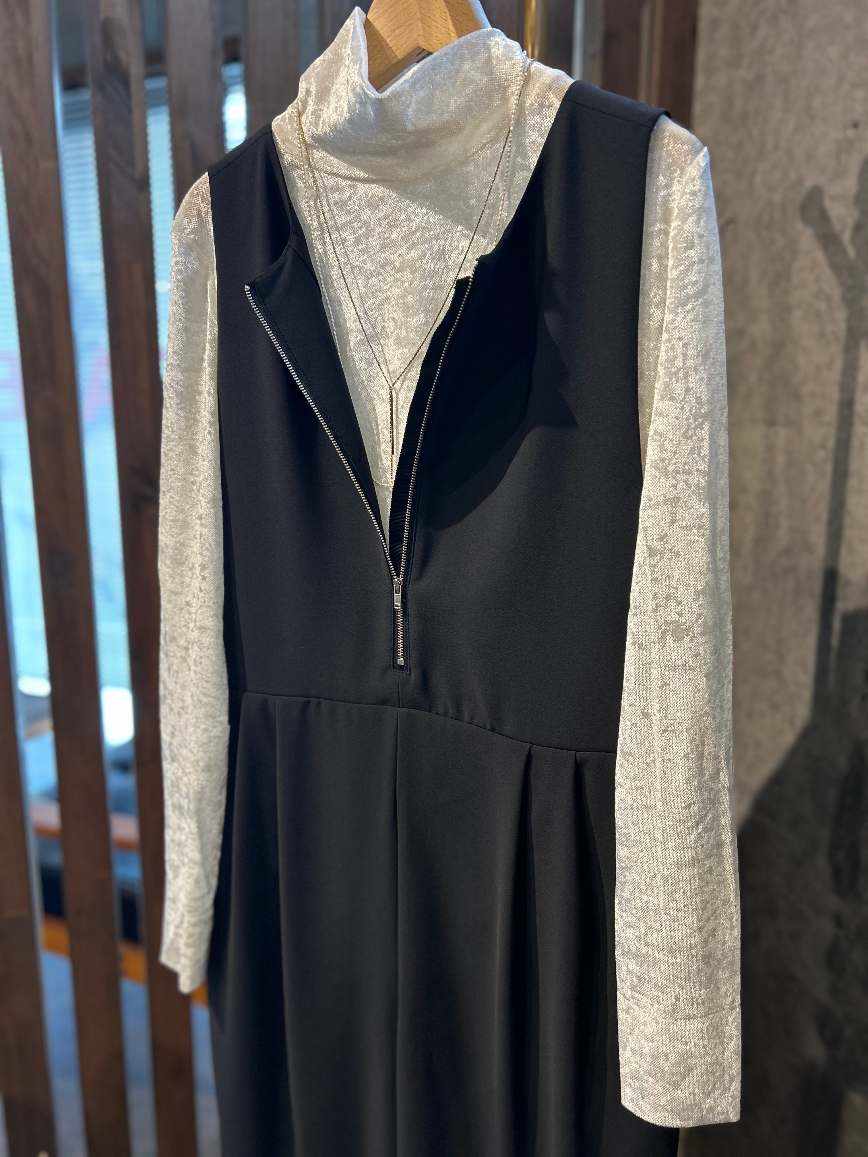 CHIGNON[シニヨン]のノースリーブカーヴィーサロペット。程よい落ち感とふくらみのある素材をセレクトしたタンクトップ型のサロペットです。身頃はコンパクトにまとめられ、ボトムにボリュームを持たせることでメリハリの利いたシルエットになっています。襟元のファスナーで顔周りを華やかに、ボトムはカーヴィーシルエットに仕上げトレンド感を演出。ブラウスなどのインナーとレイヤードスタイルを楽しんでいただけます。