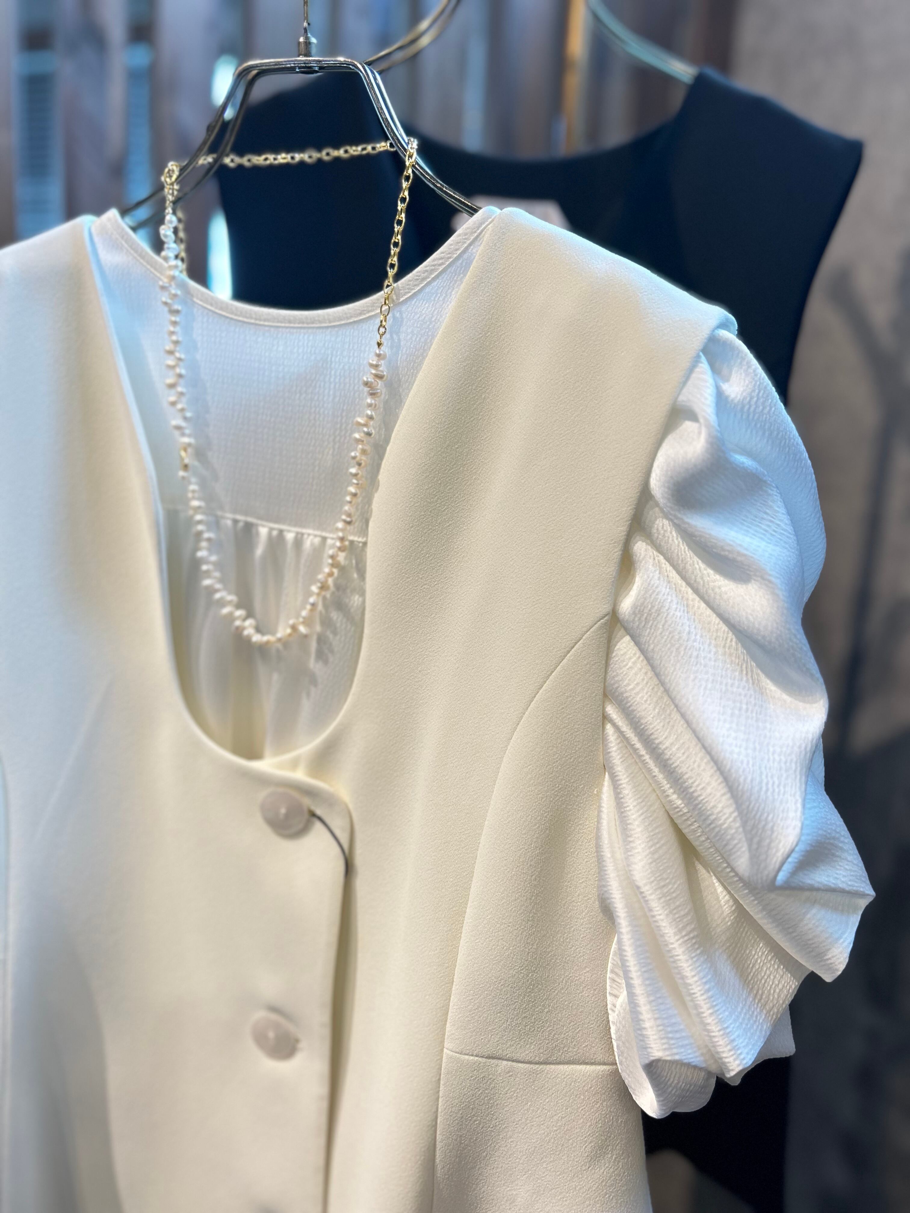肩幅を極限まで内側にいれて、肩巾が小さくに見えるように作ったパワーショルダーは、二の腕の華奢見せ効果もあり、肩や腕回りの気になる厚みもカバーできます。