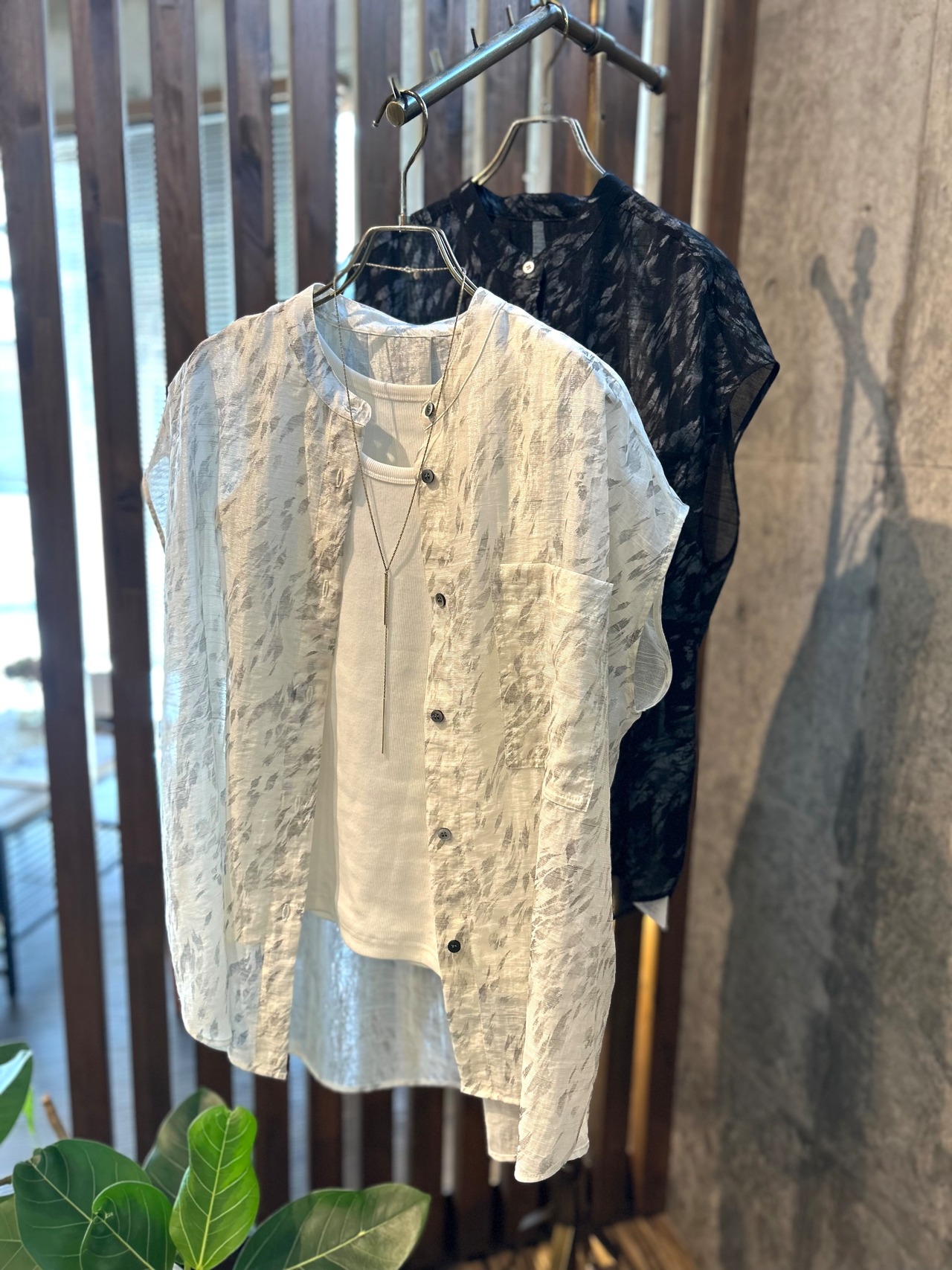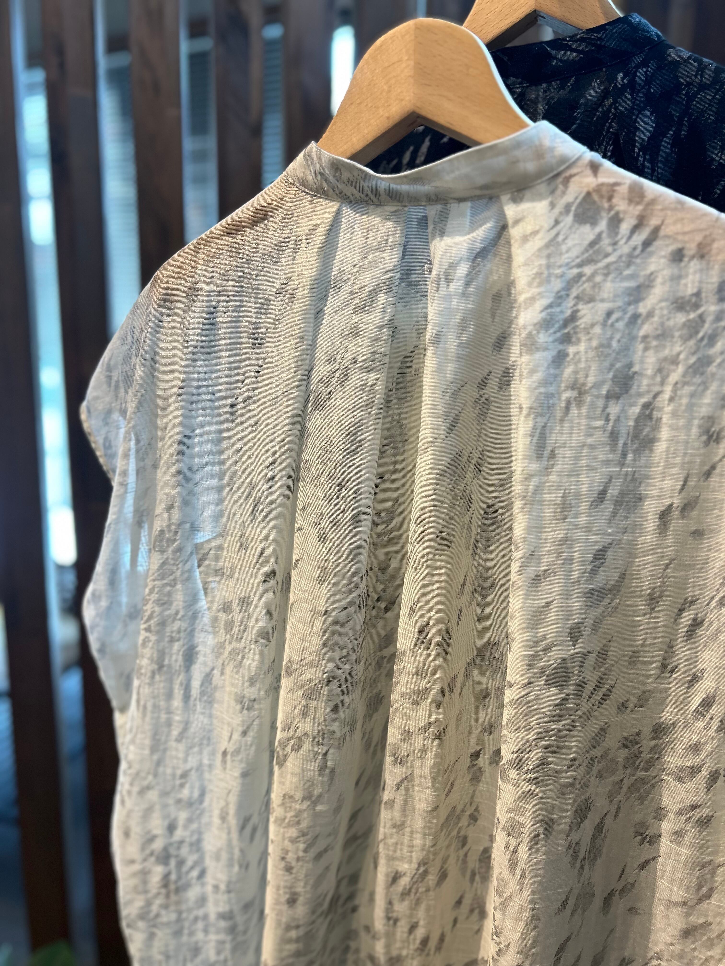 程よいハリ感のあるシアー素材に単色プリントを施した生地が特徴のフレンチスリーブシャツです。