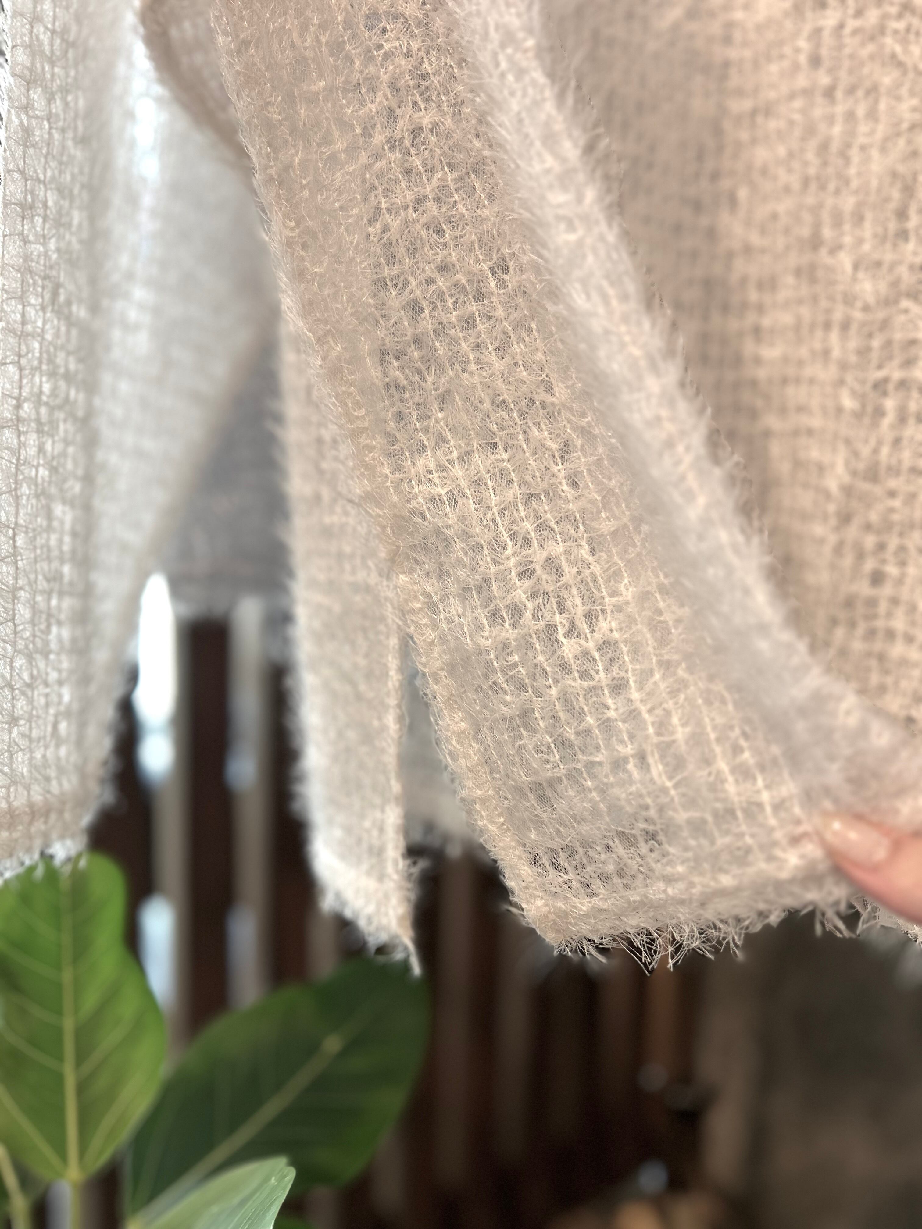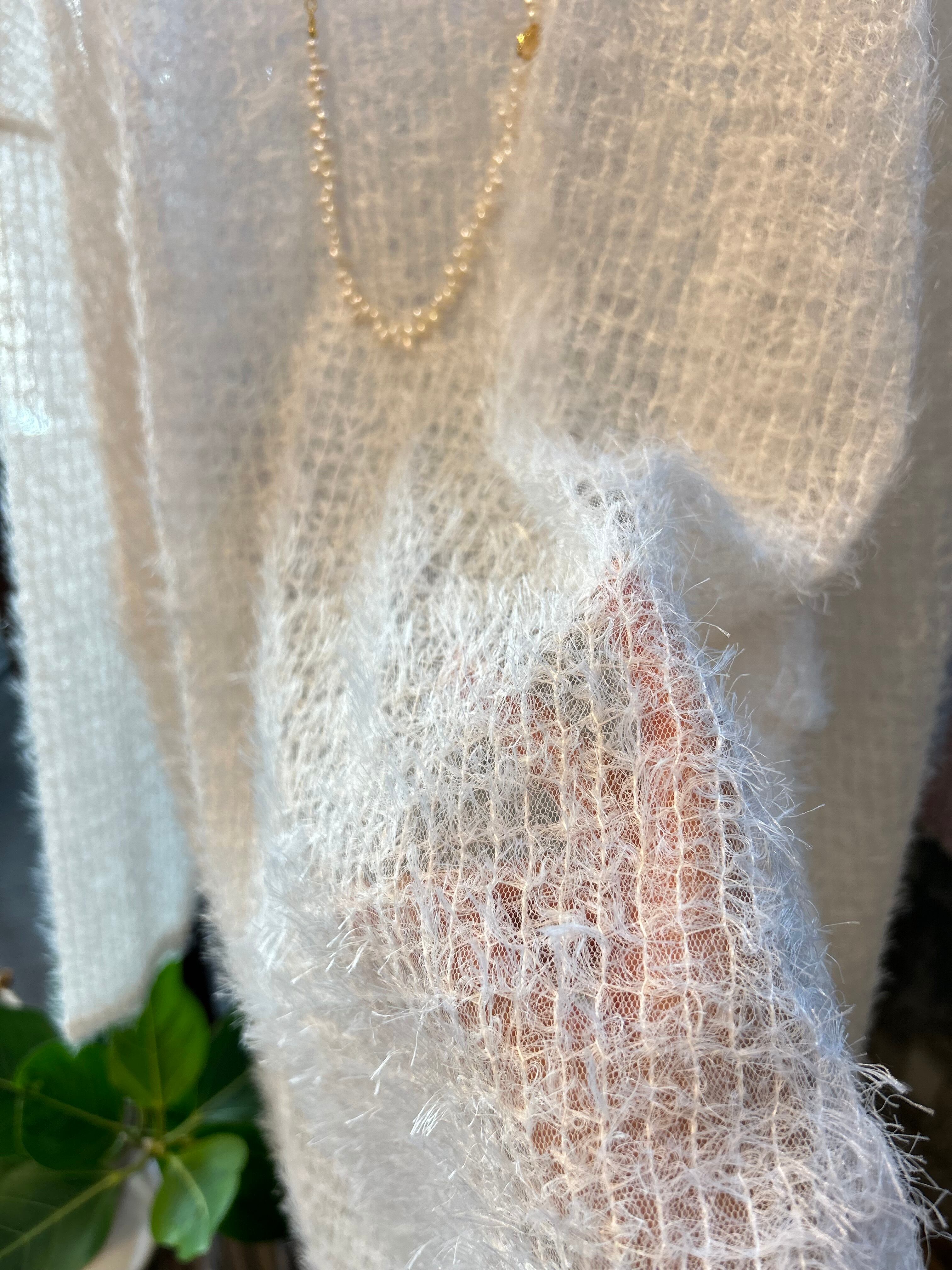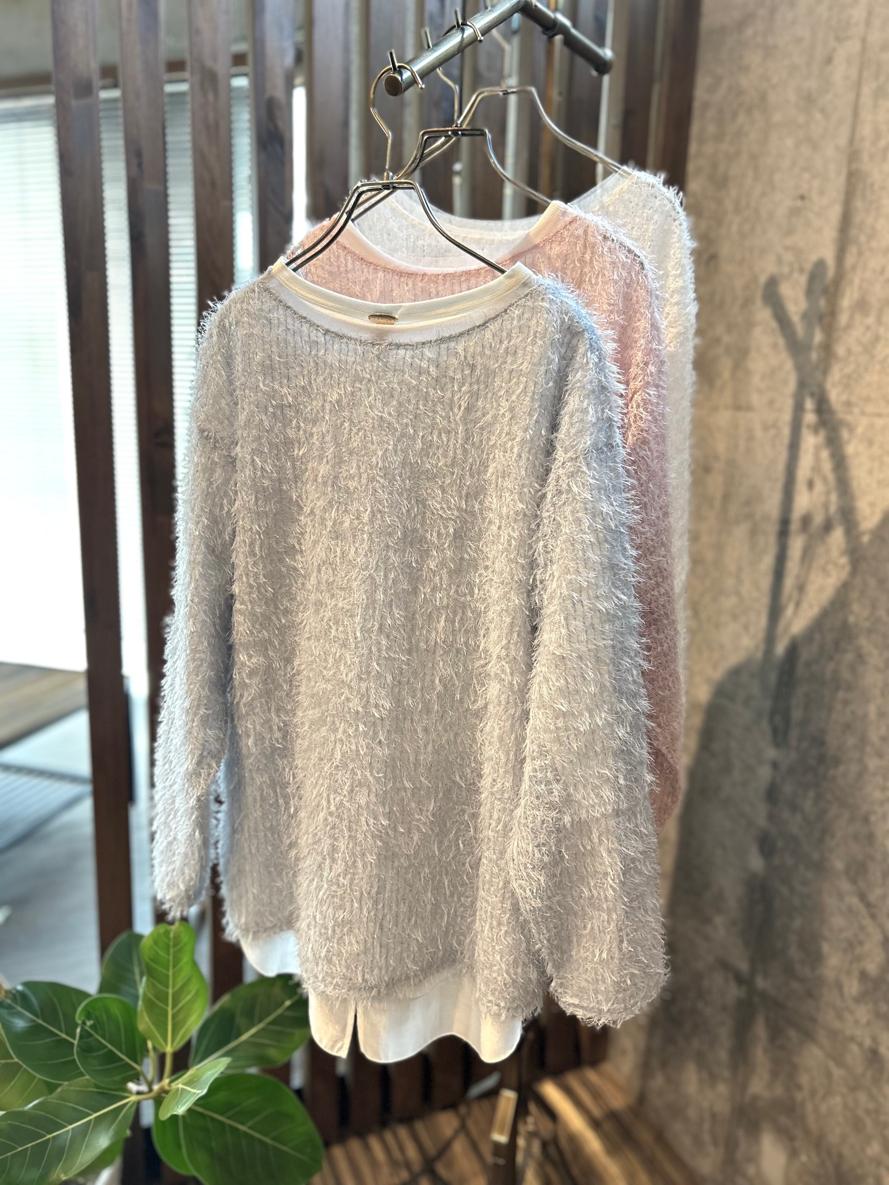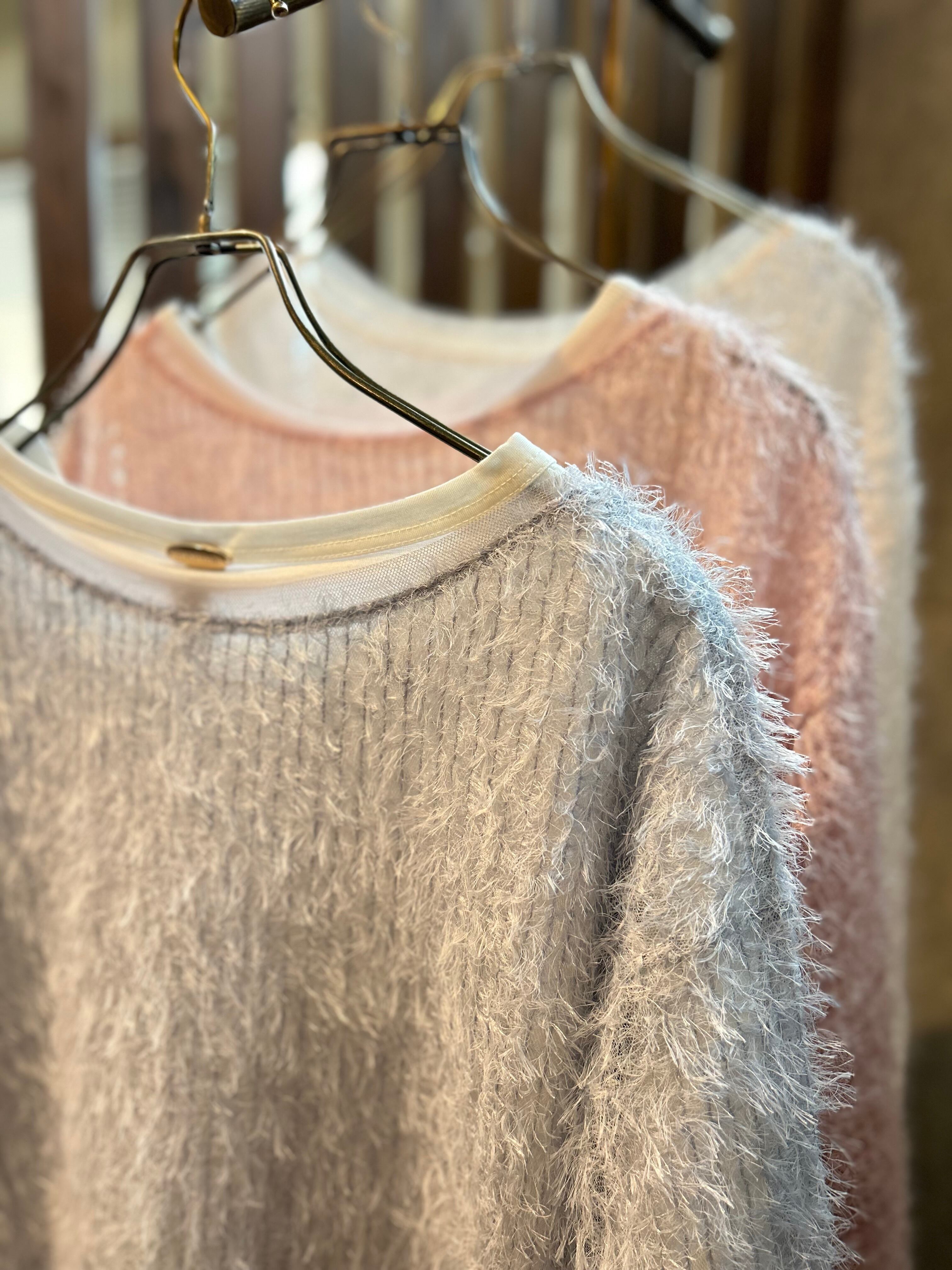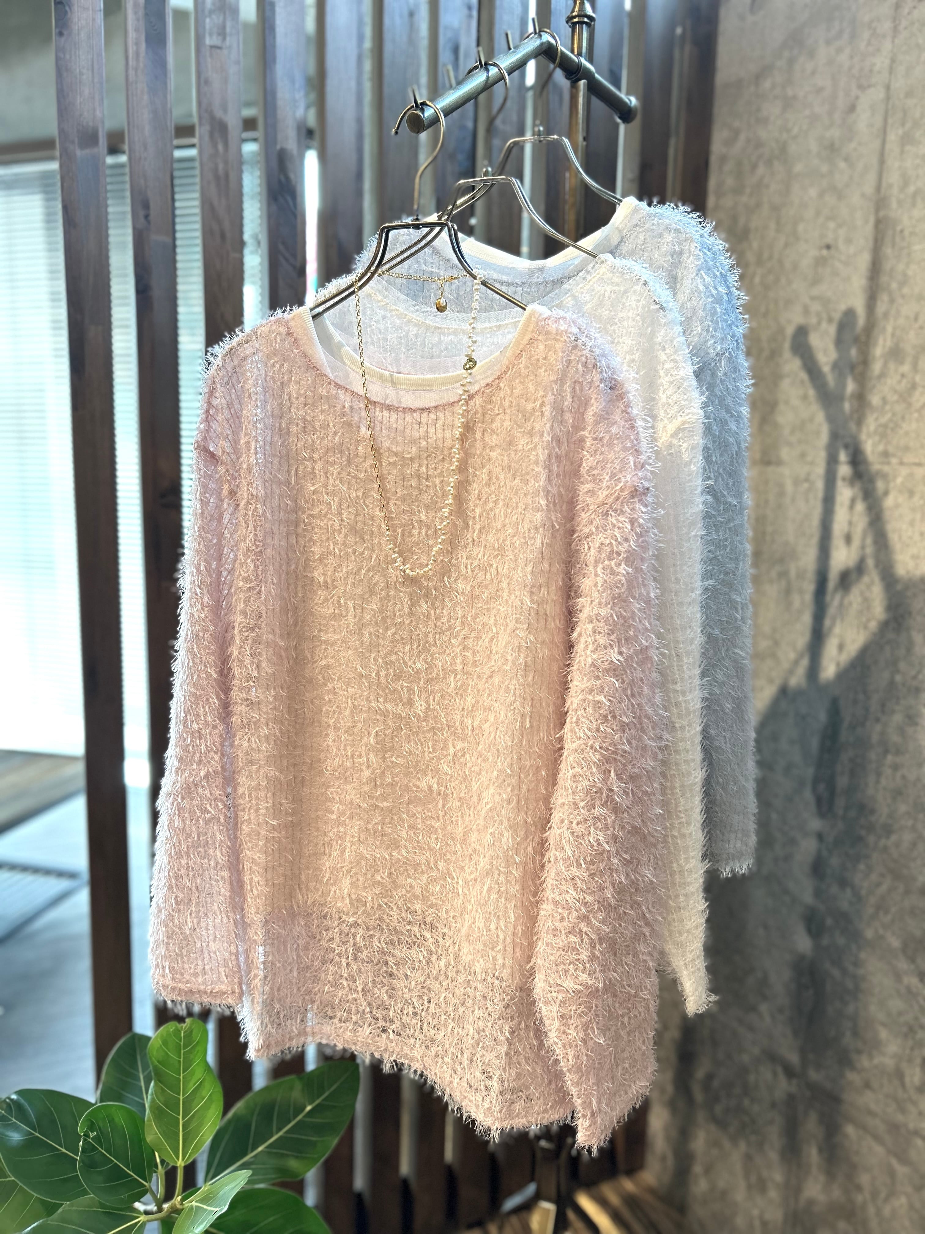 毛足がふわりとしたフェザーをチュール素材に編み込ませた、華やかな印象のプルオーバー。