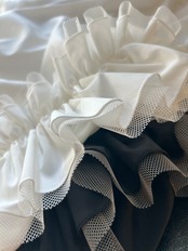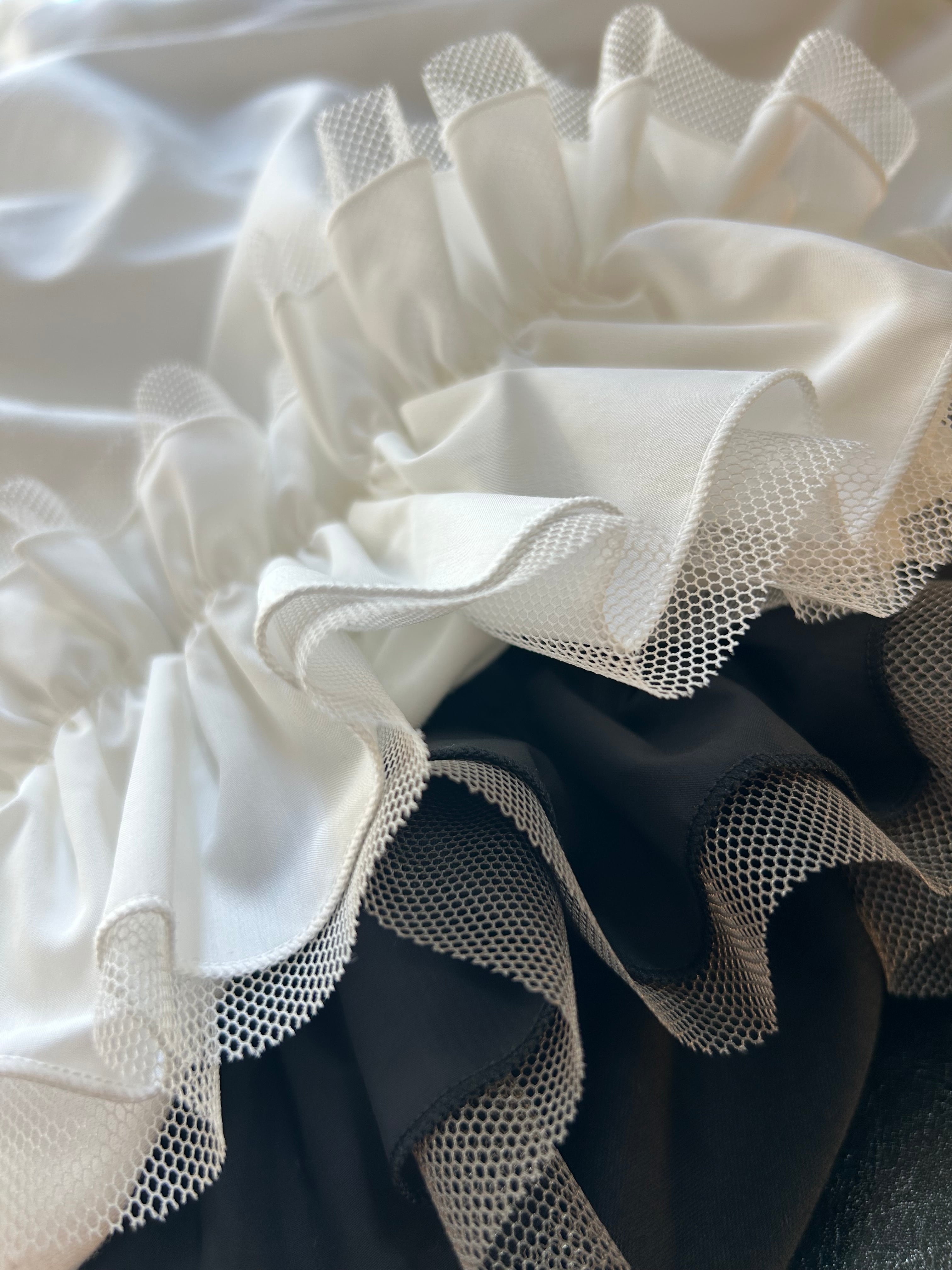 チュールとタフタを2枚重ねたフリルを前後の左サイドに配した大人フェミニンなカットソー。