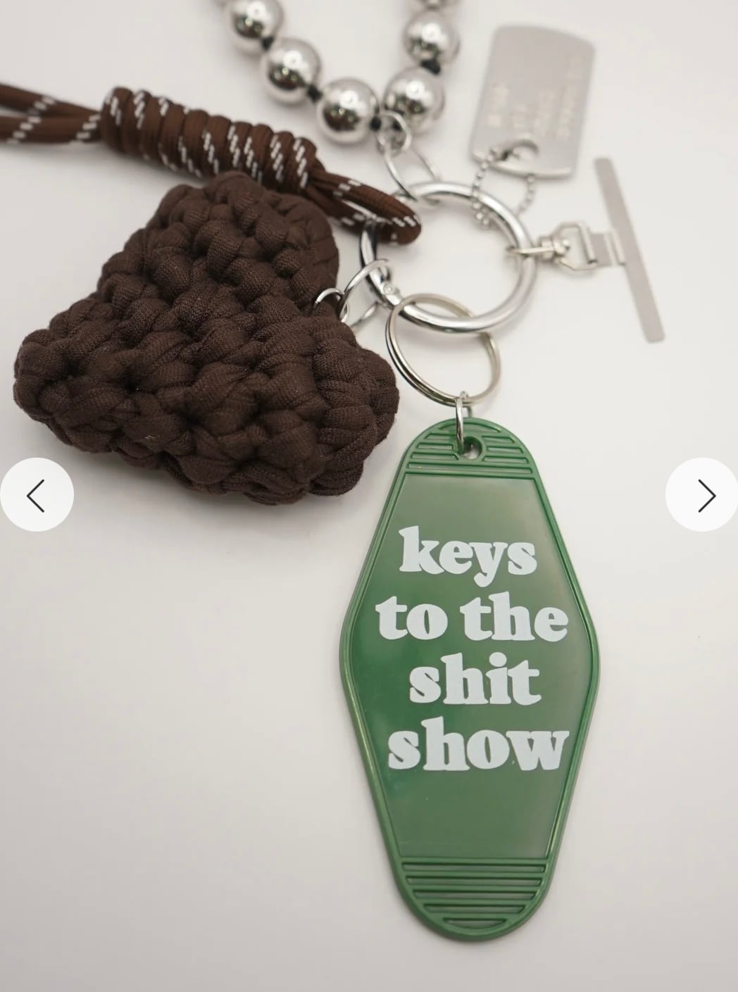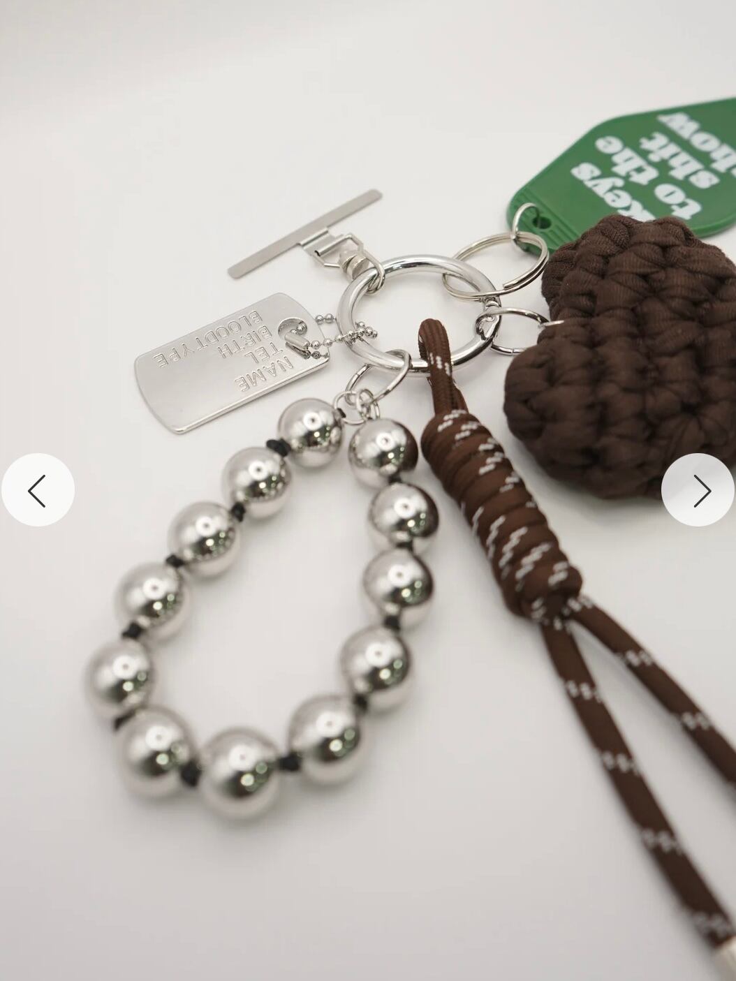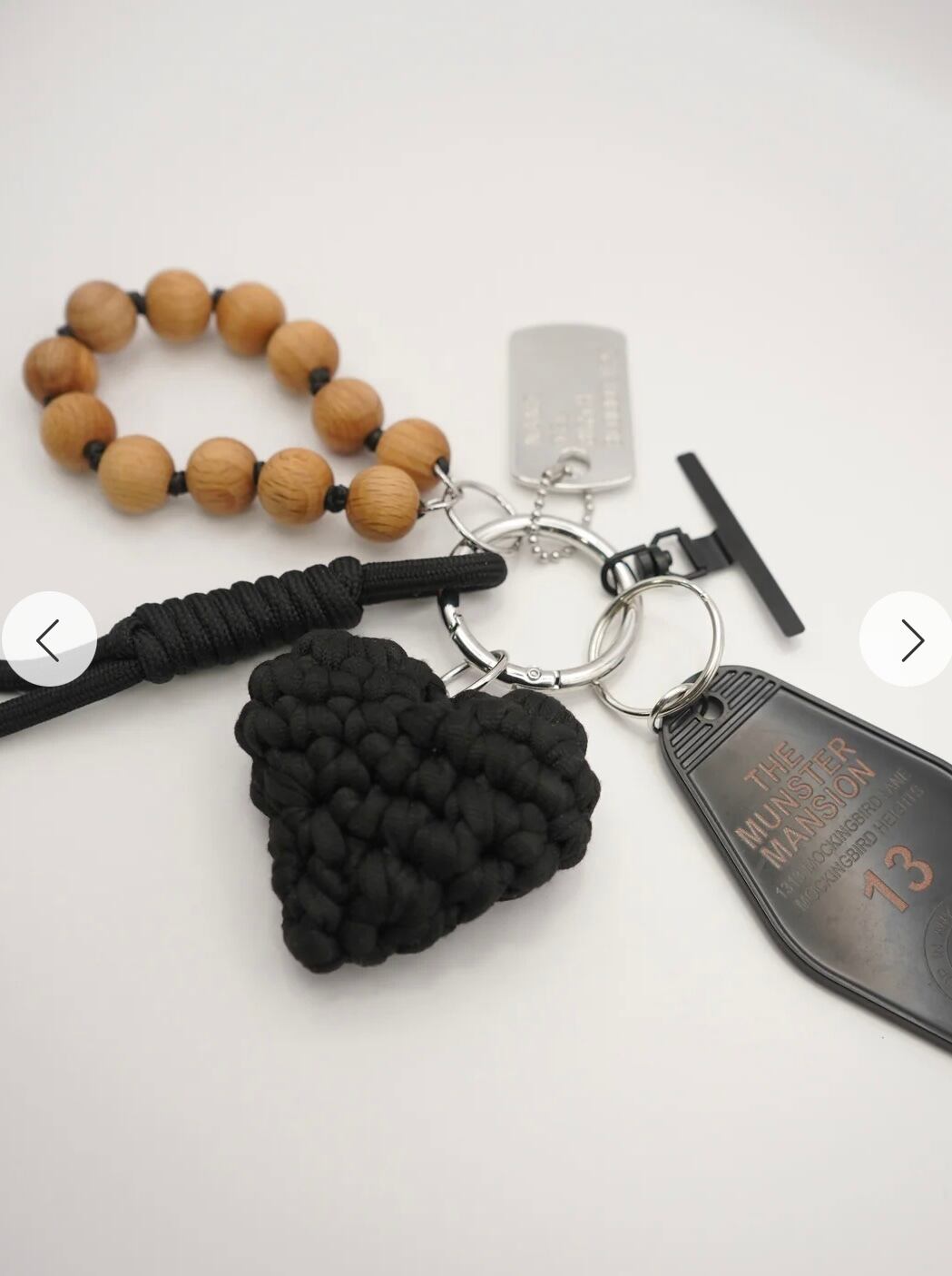 存在感のある太めコード、手編みハート、ドッグタグ、モーテルキー風キーホルダー、それぞれのパーツはすべて取り外し可能なので、その日の気分やシーンに合わせてカスタムして自由にアレンジができます。