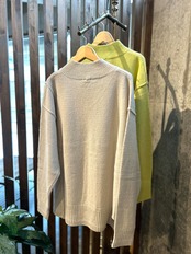 ふんわりと軽さのあるウール100%の糸を使用したプルオーバーです。ハイネックとVネックの中間のような衿がモードな印象で、ハイネックやタートルネックの首に当たる感じが苦手な方にもおすすめのアイテムです。アシンメトリーにいれた切り替えのアウトリンキングや、裾脇のホールデザインで、シンプルすぎない遊びのあるトップスに仕上げました。ウール100ながら家で洗える素材というのもおすすめポイントです。