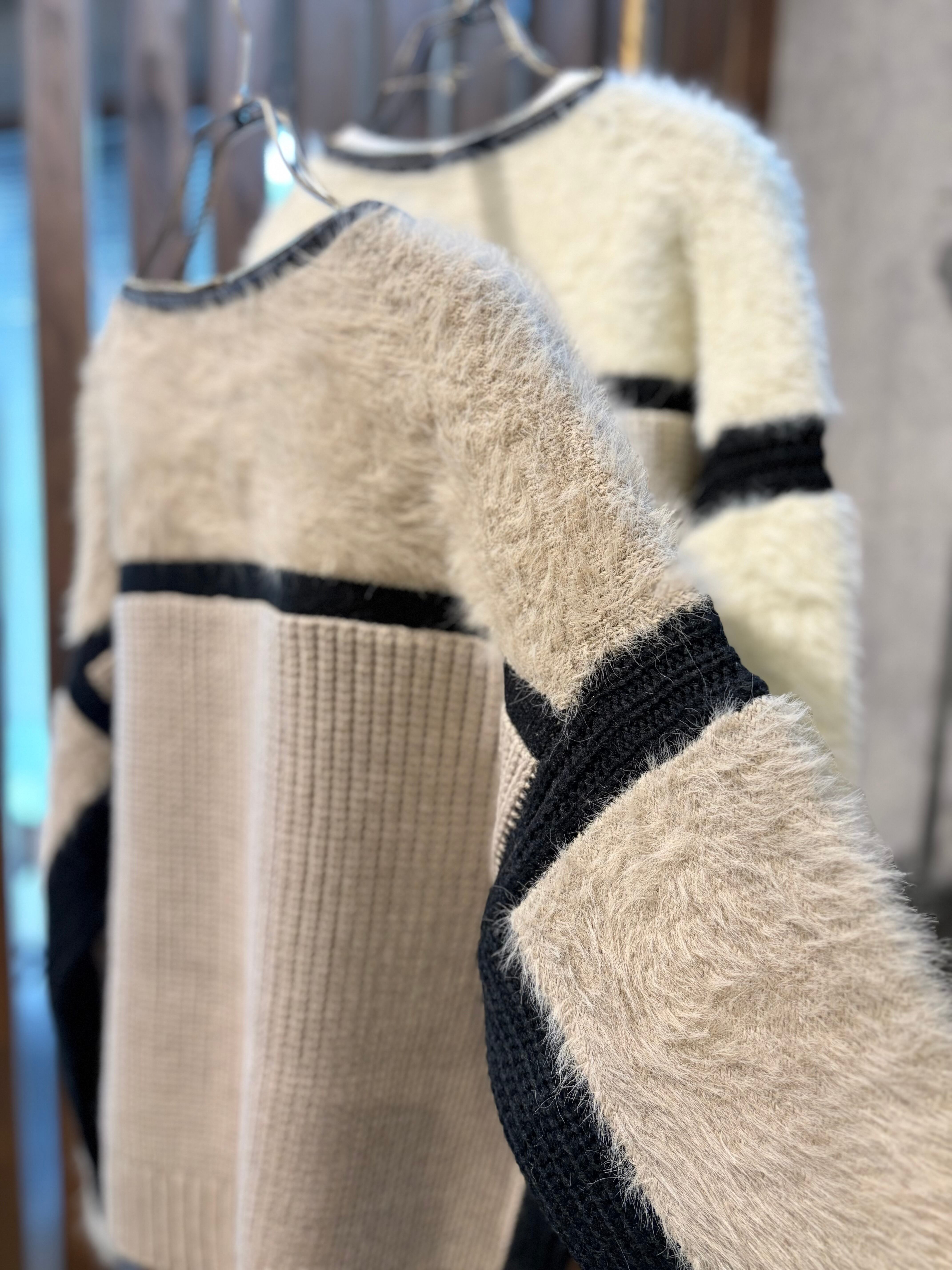 シャギーヤーンの持つ上品な雰囲気をジップのレザーパイピングがきりりと引き締め、リラックスした着心地ながらかっちりしたジャケットのようなクラス感を与えてくれます。