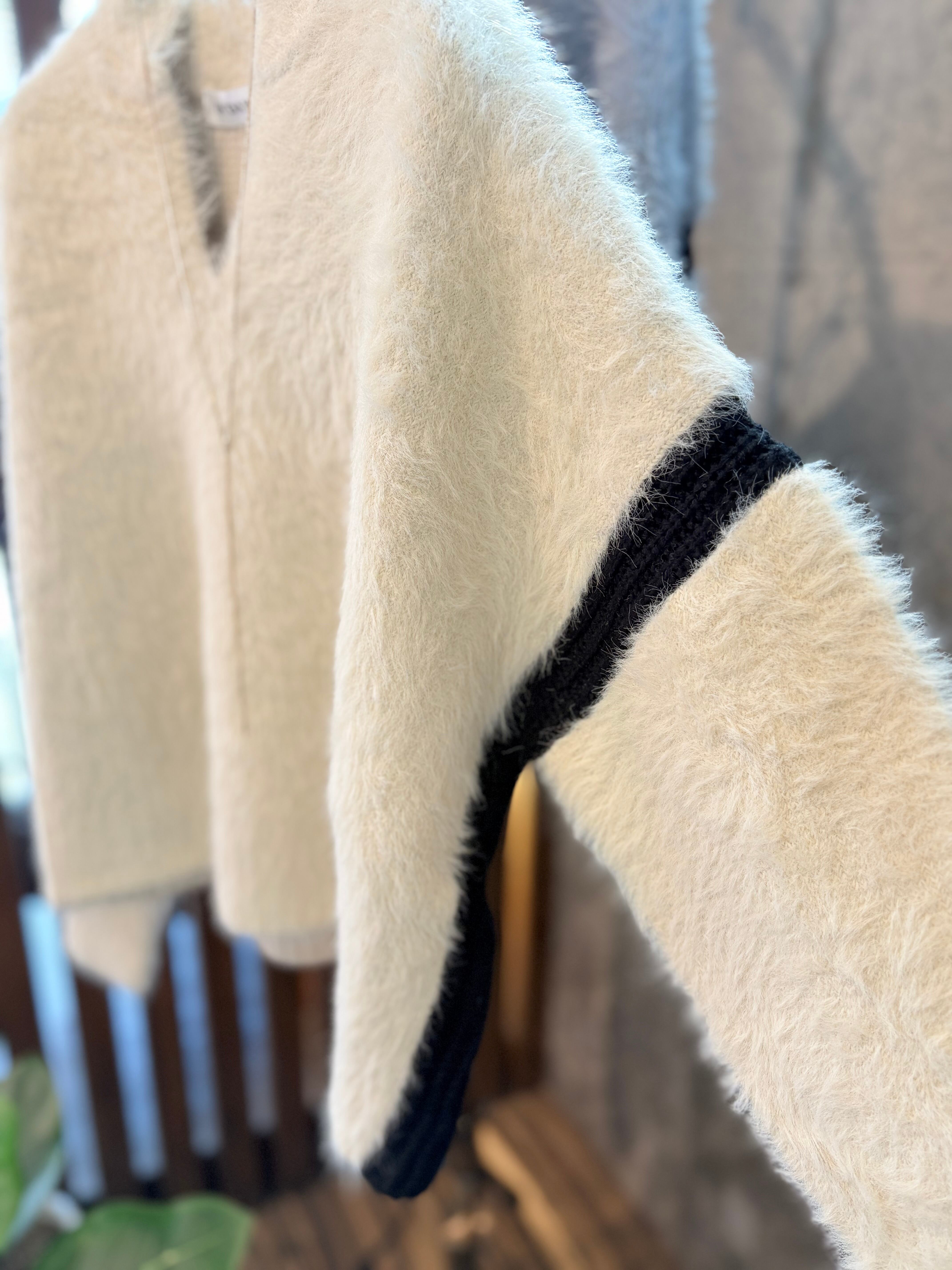 毛足の長い華やかな素材に、キーホールネックと袖の配色ラインを加えたことでシャープな印象を与えてくれます。