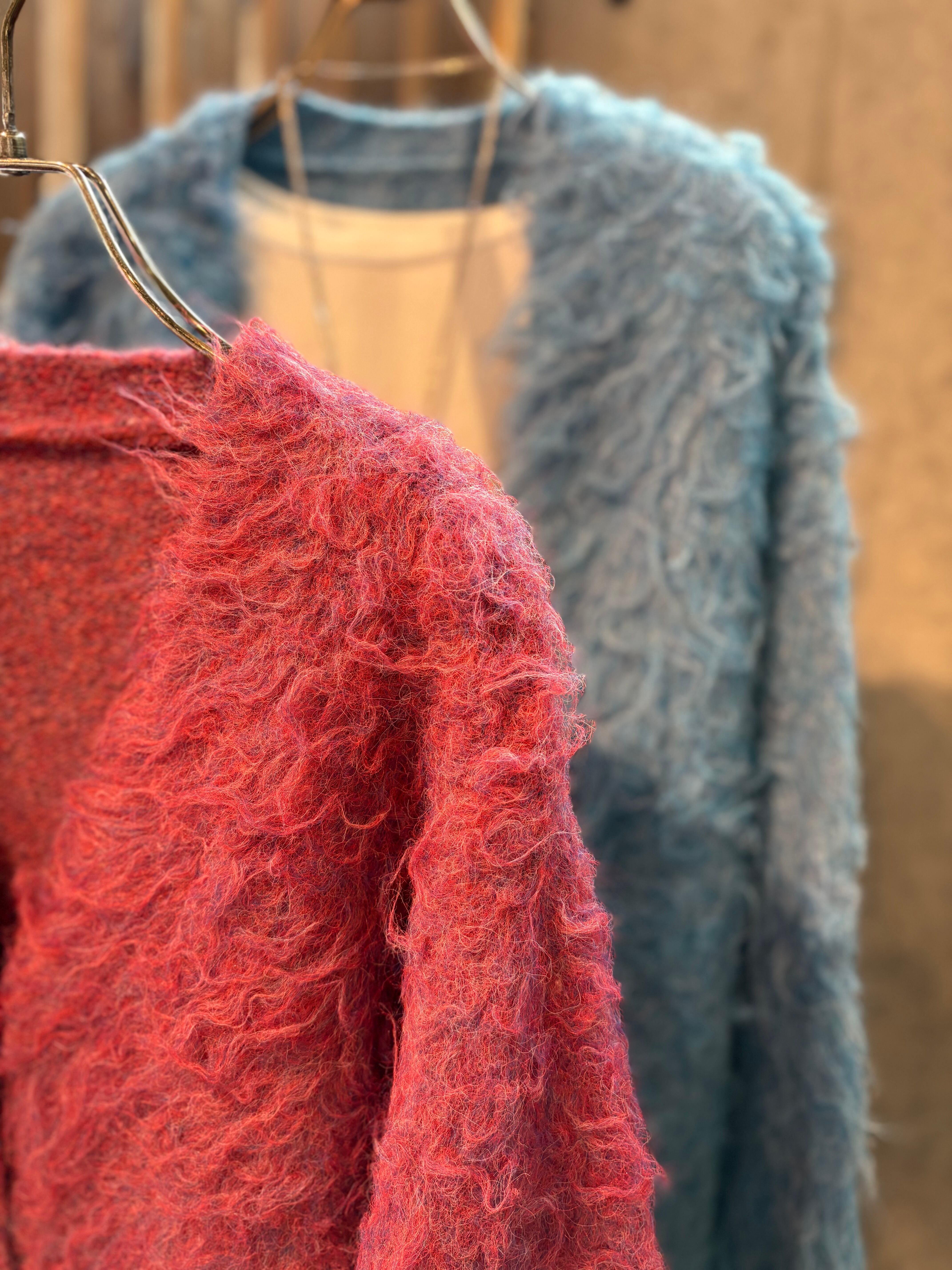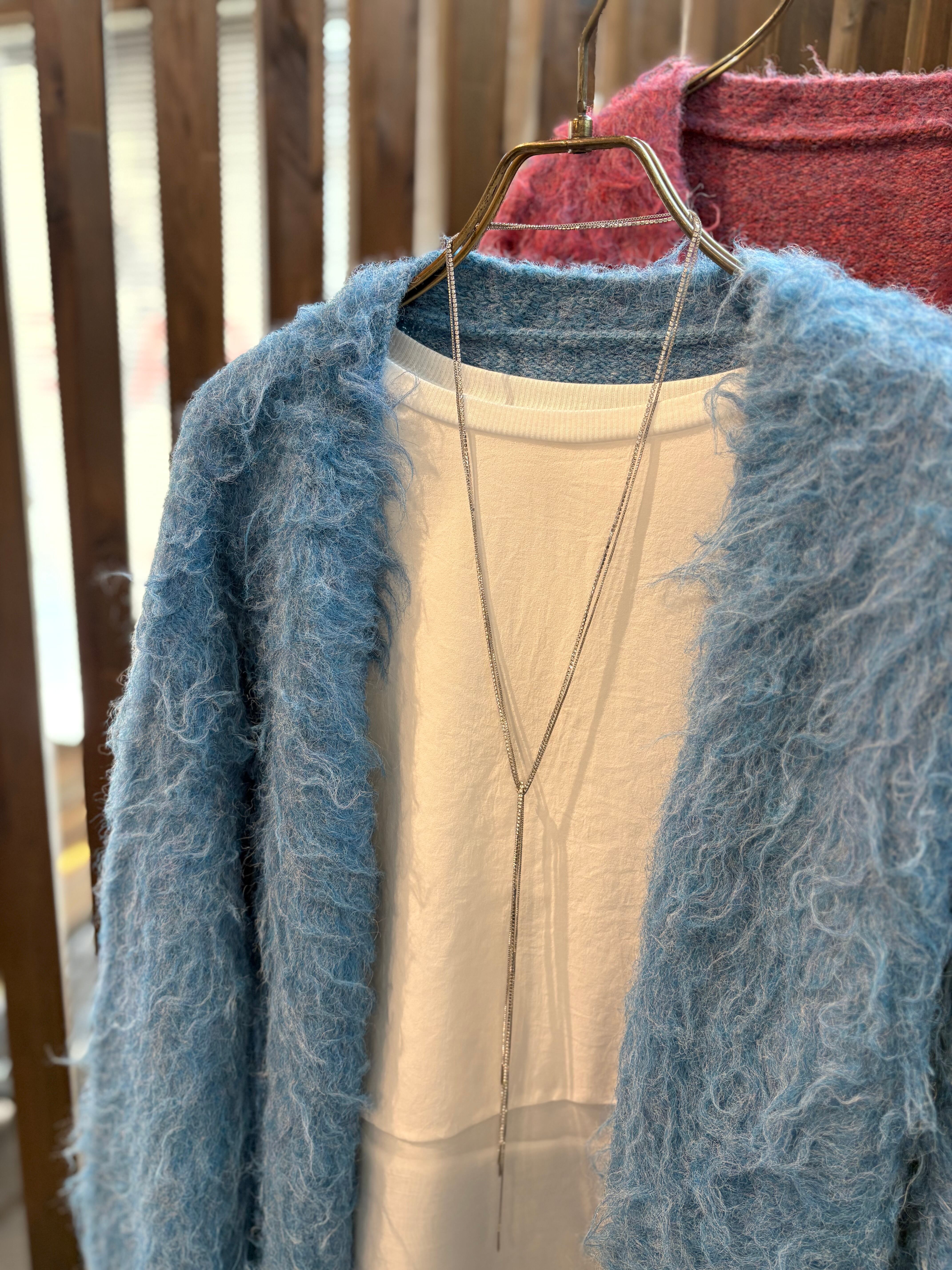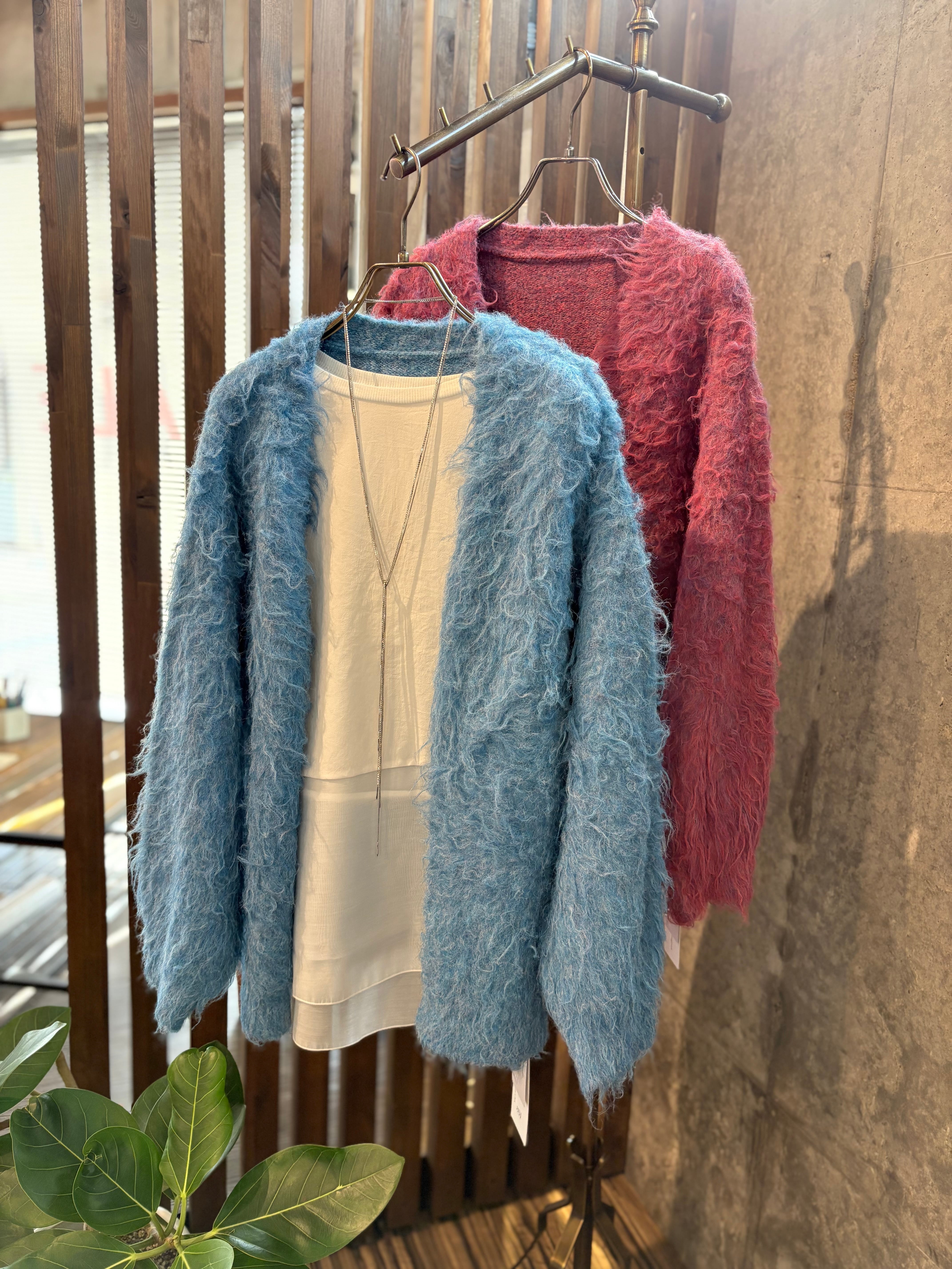 少し毛足の長いシャギーカーデはいつものコーデに取り入れれば華やかな印象にしてくれます。
