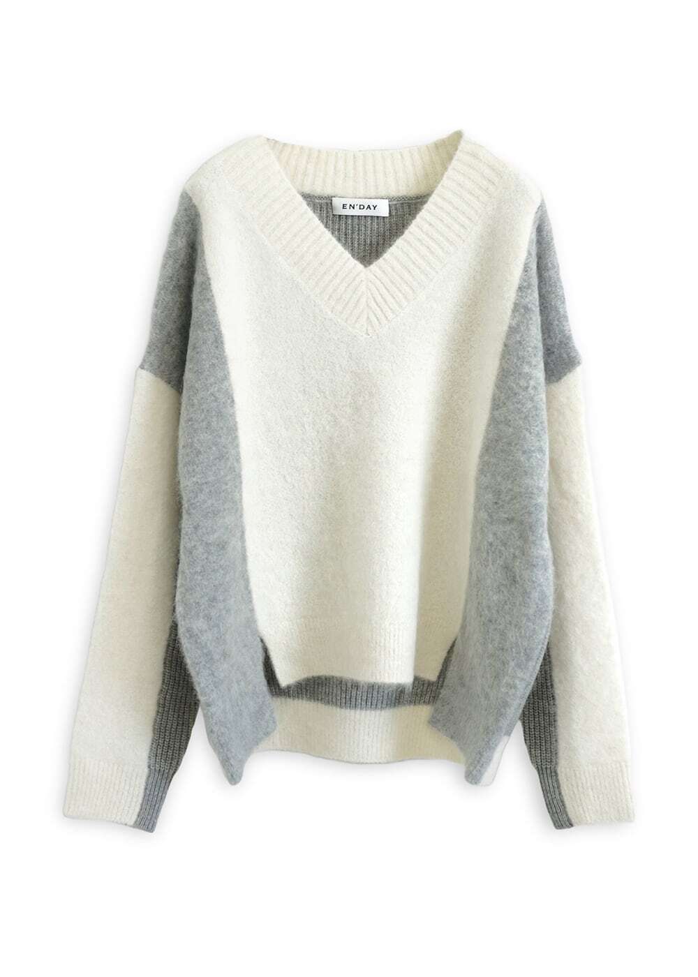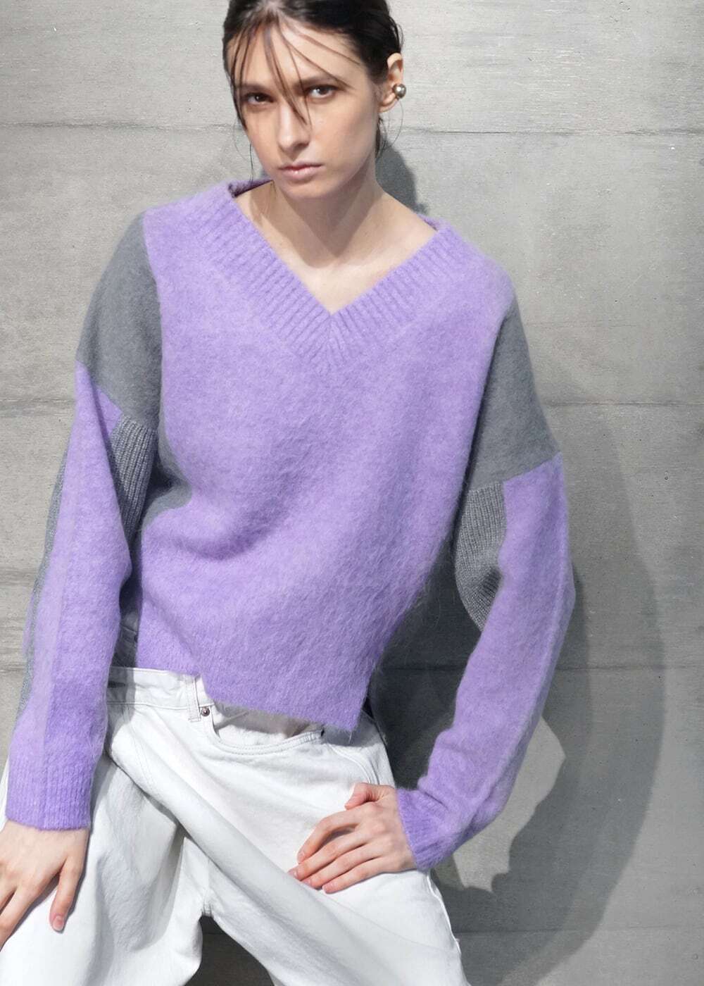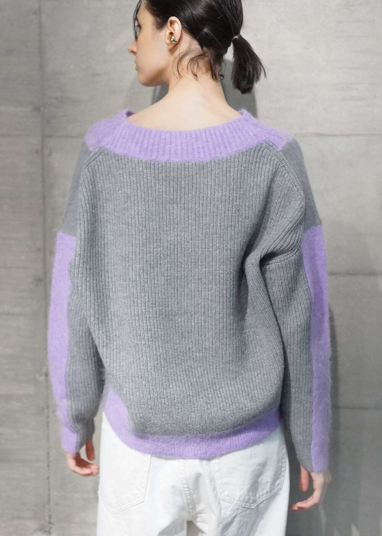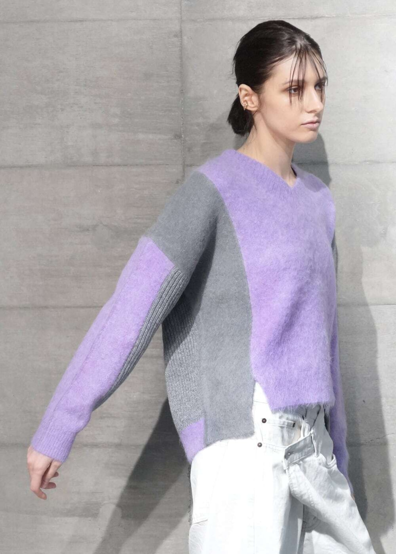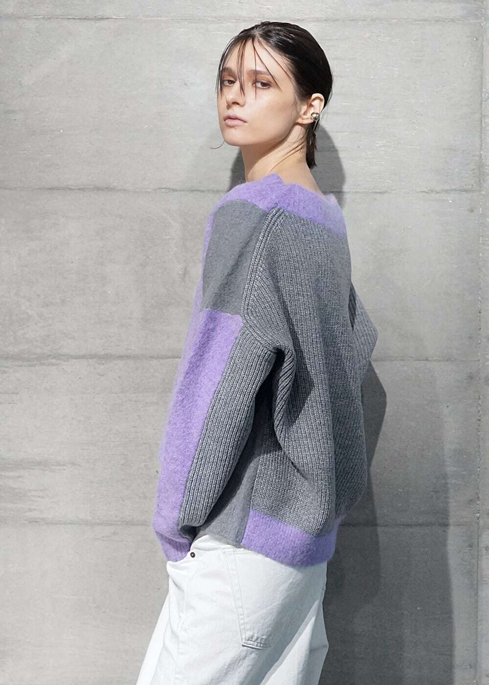 動くたびにドラマチックな表情を見せる、アルパカシャギーのカラーブロッキングニット。