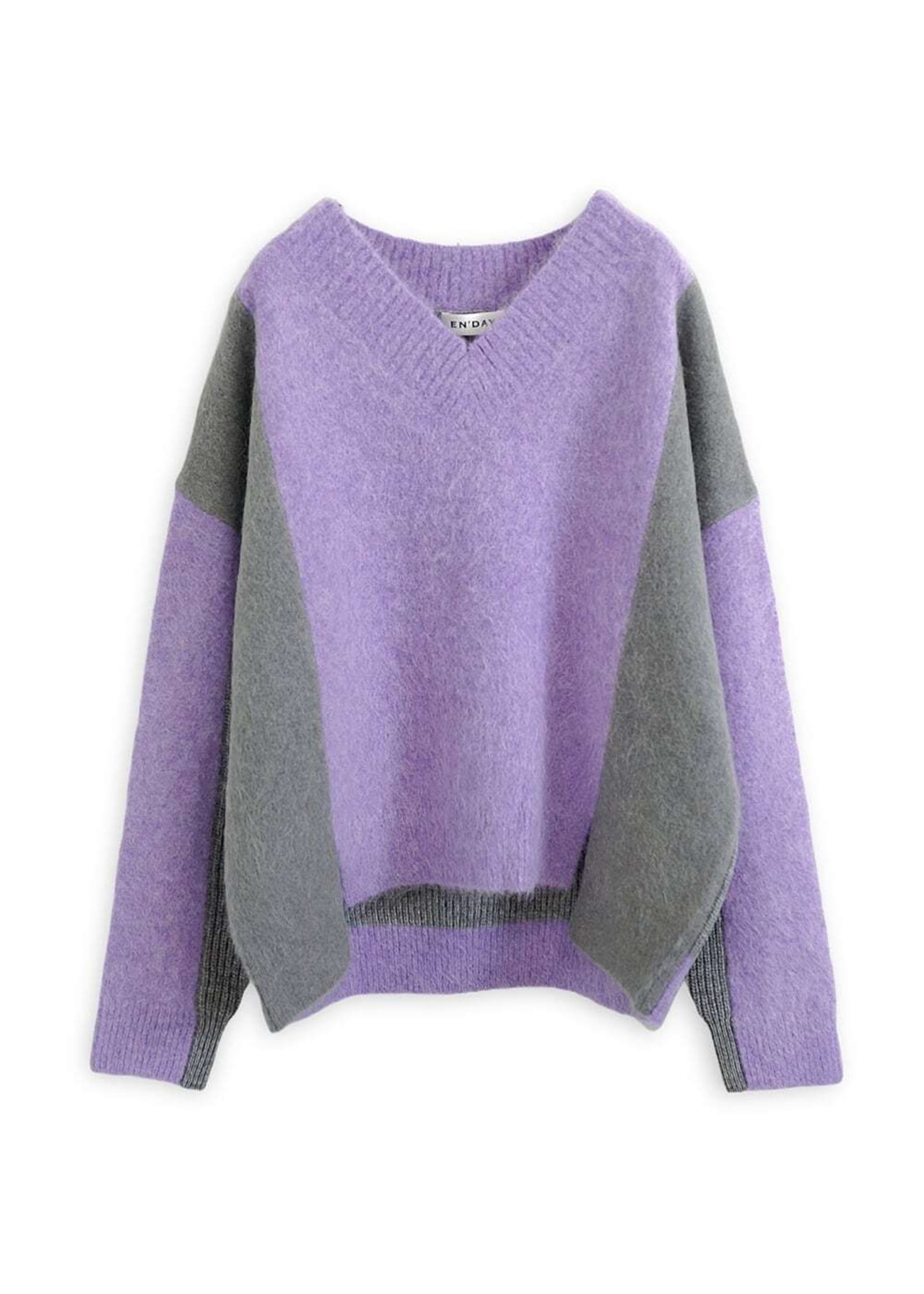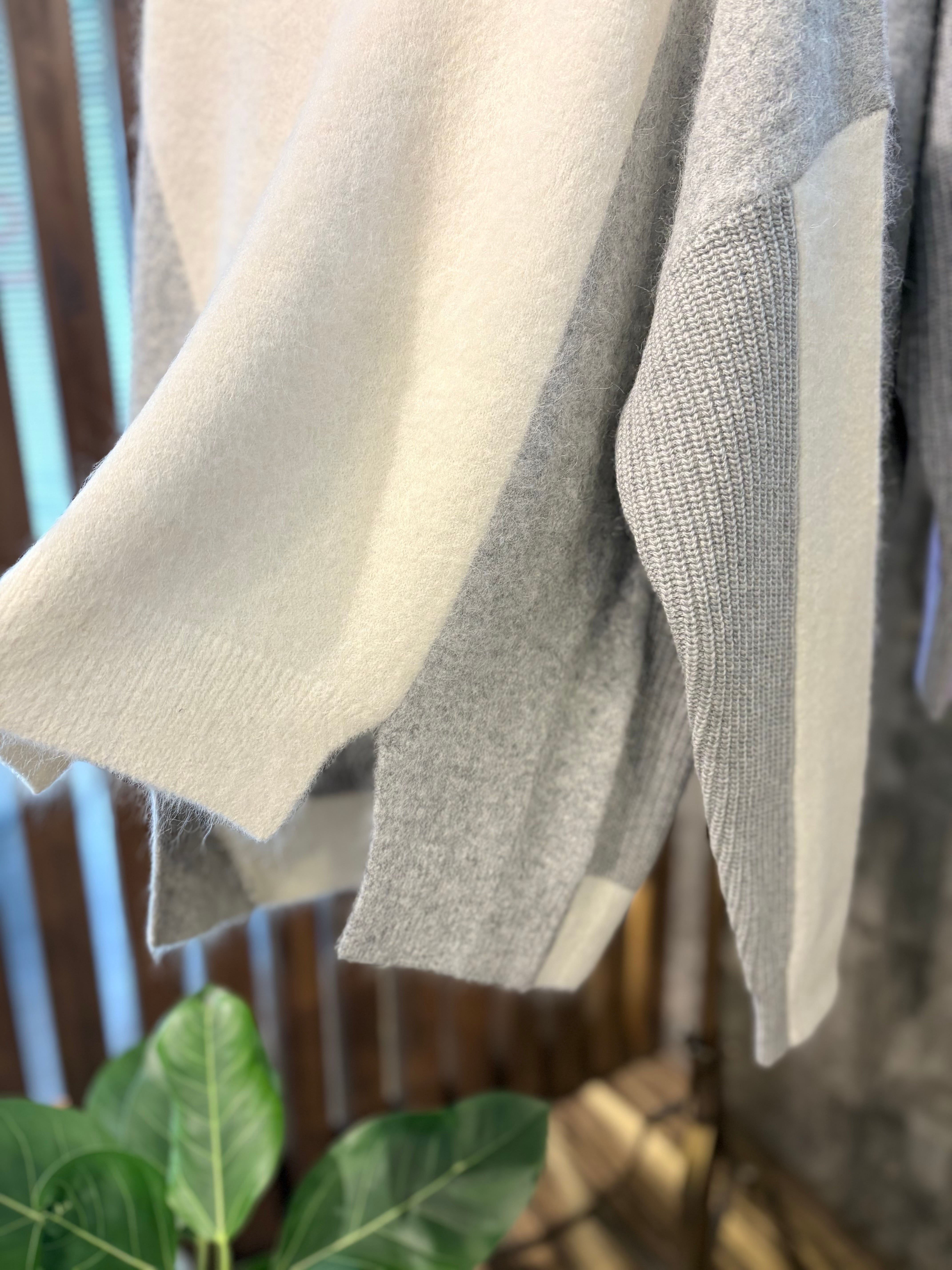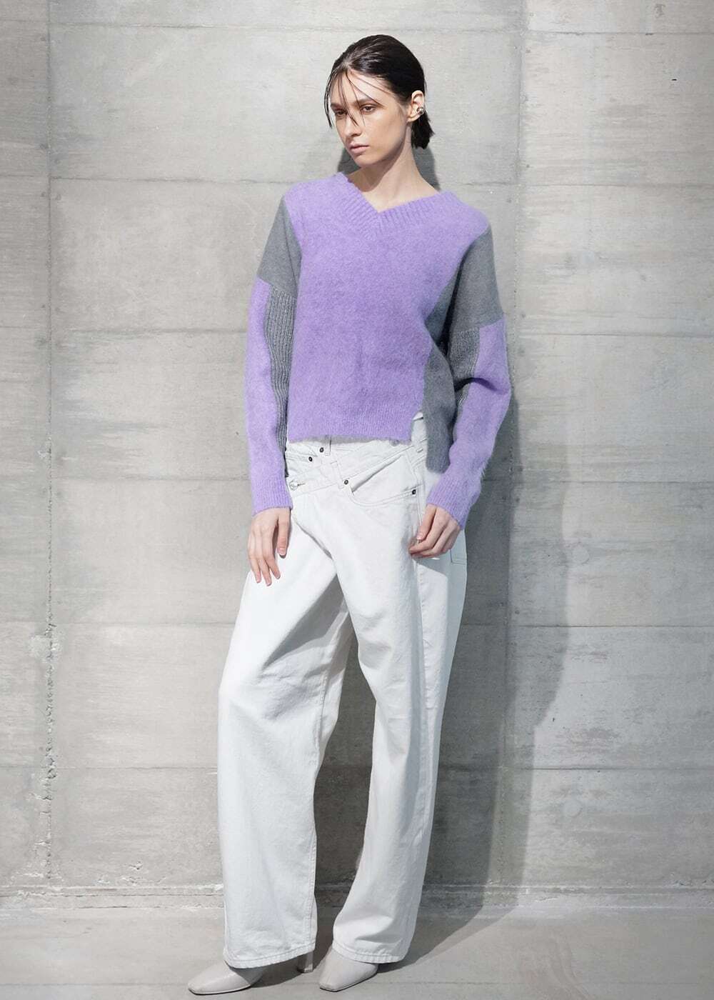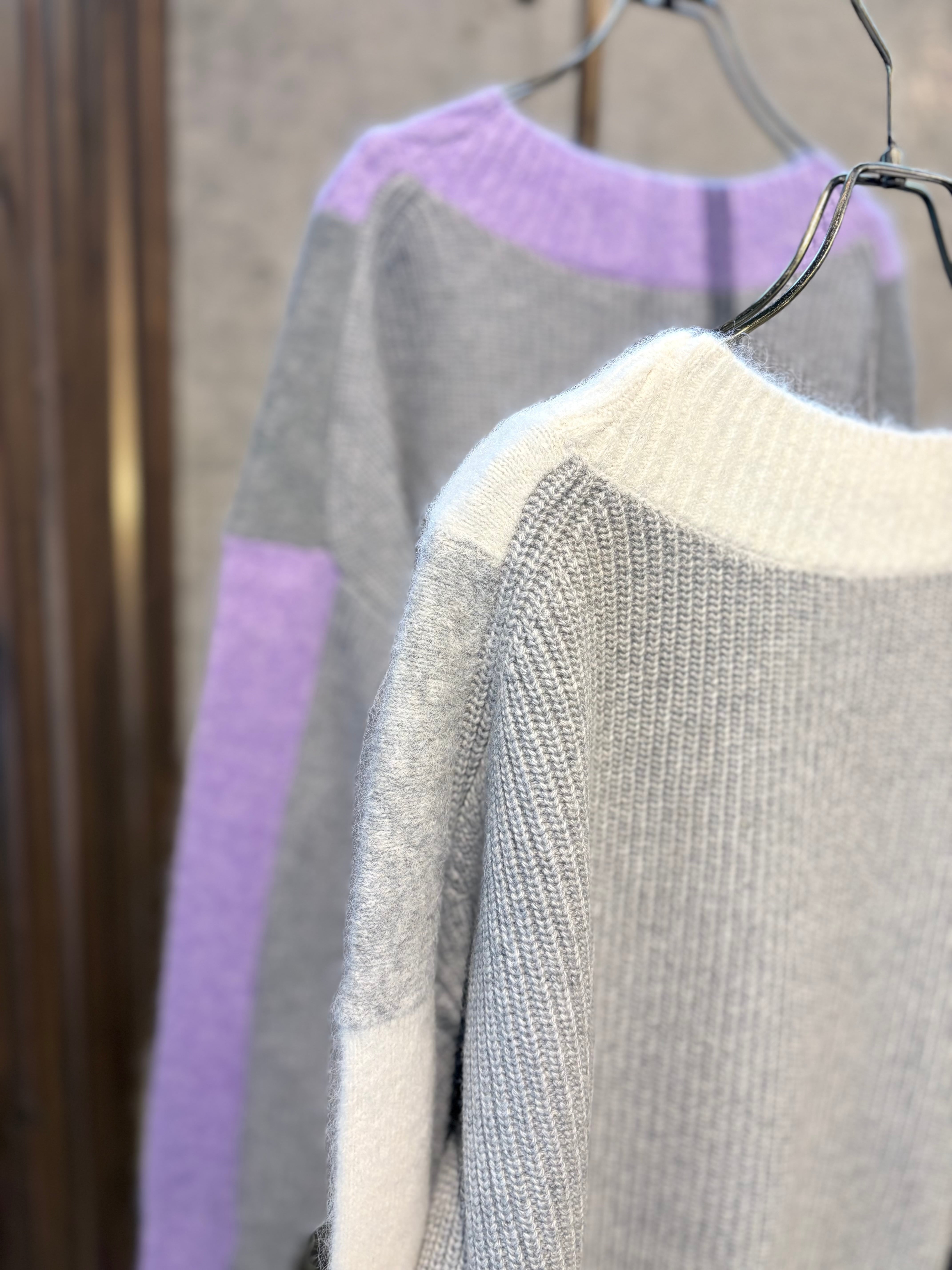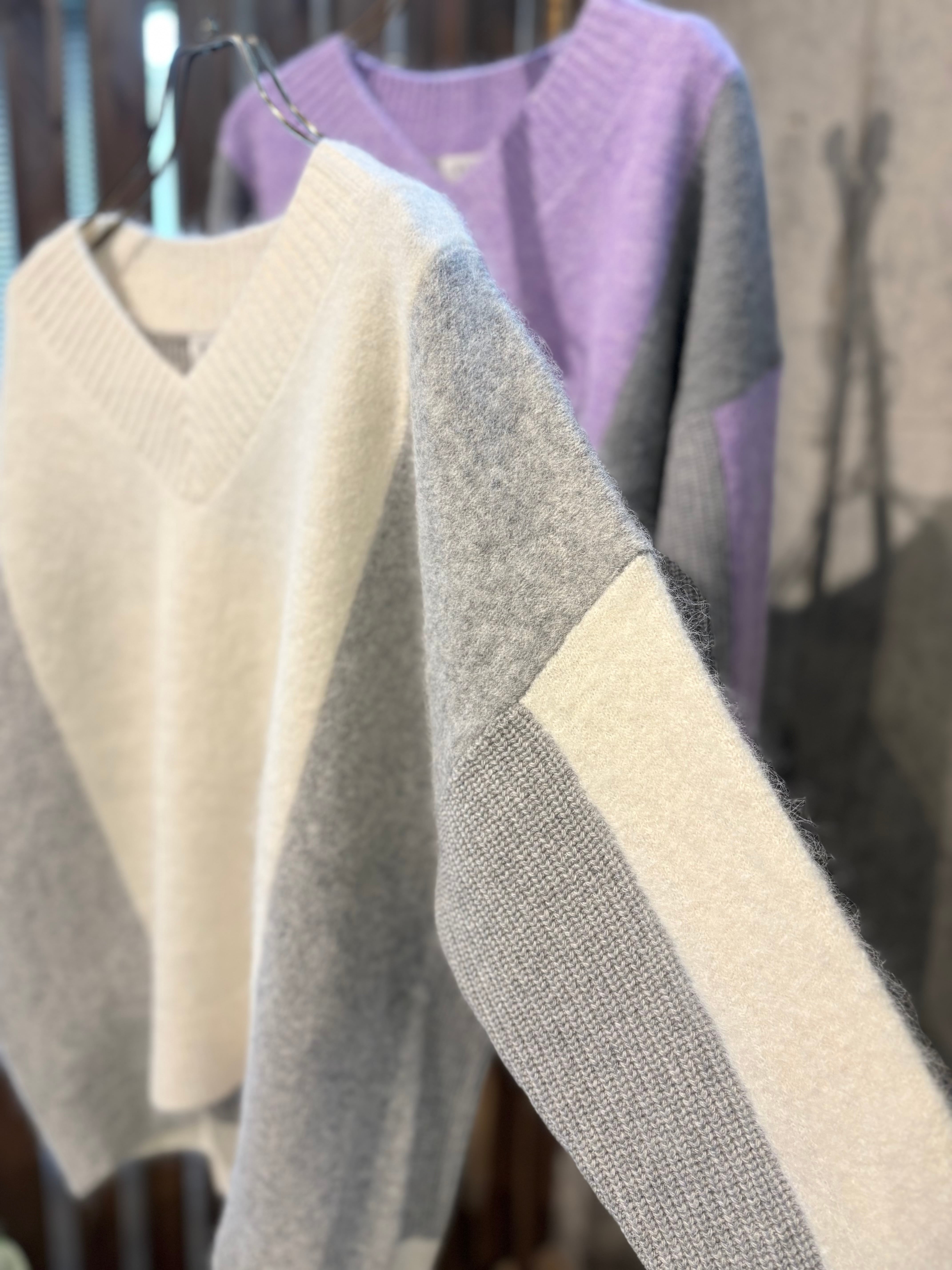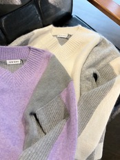 動くたびにドラマチックな表情を見せる、アルパカシャギーのカラーブロッキングニット。