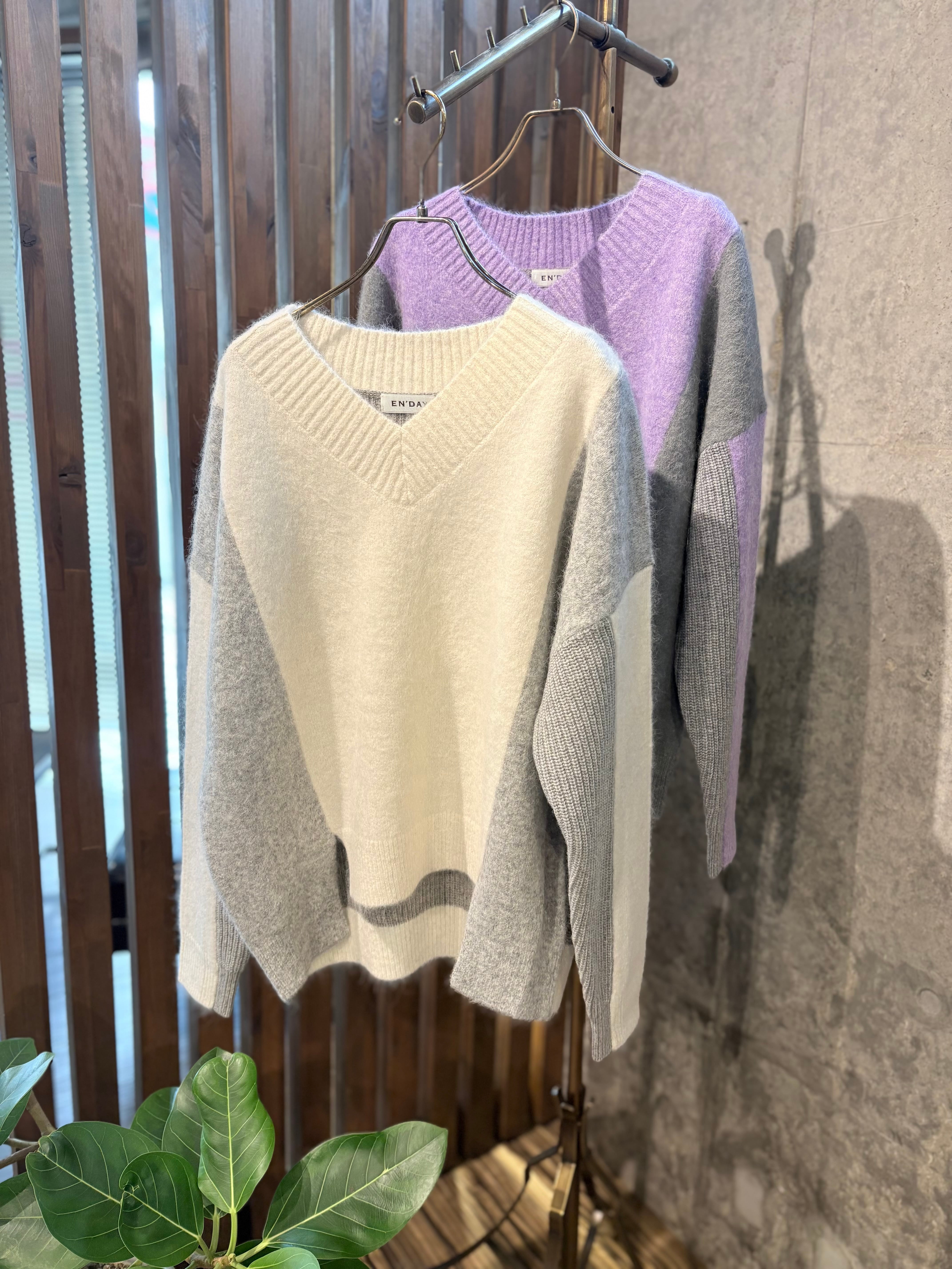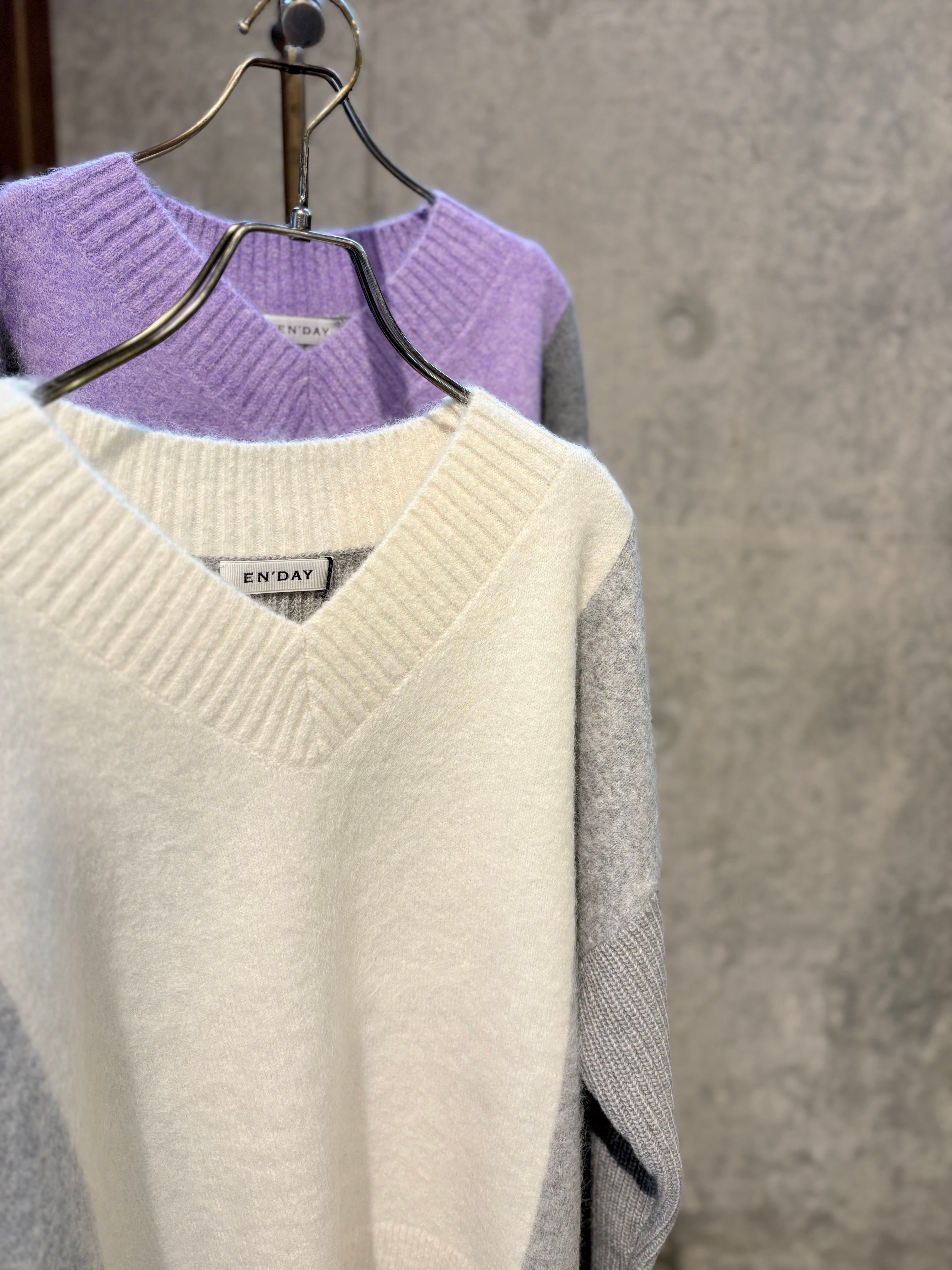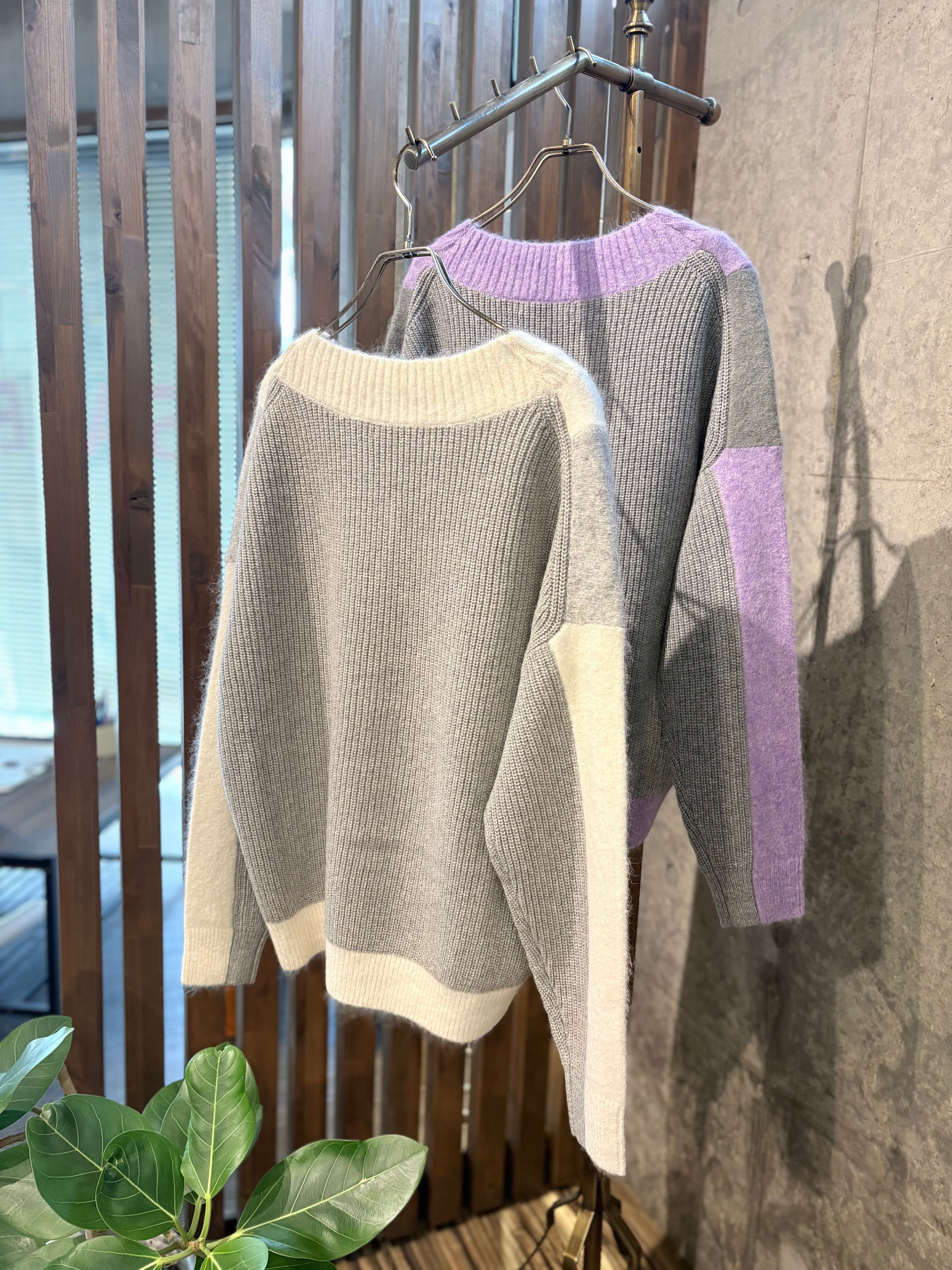 バイカラー部分には片畦柄をあしらい、ニット一枚でも自然に着映えるコントラスト。