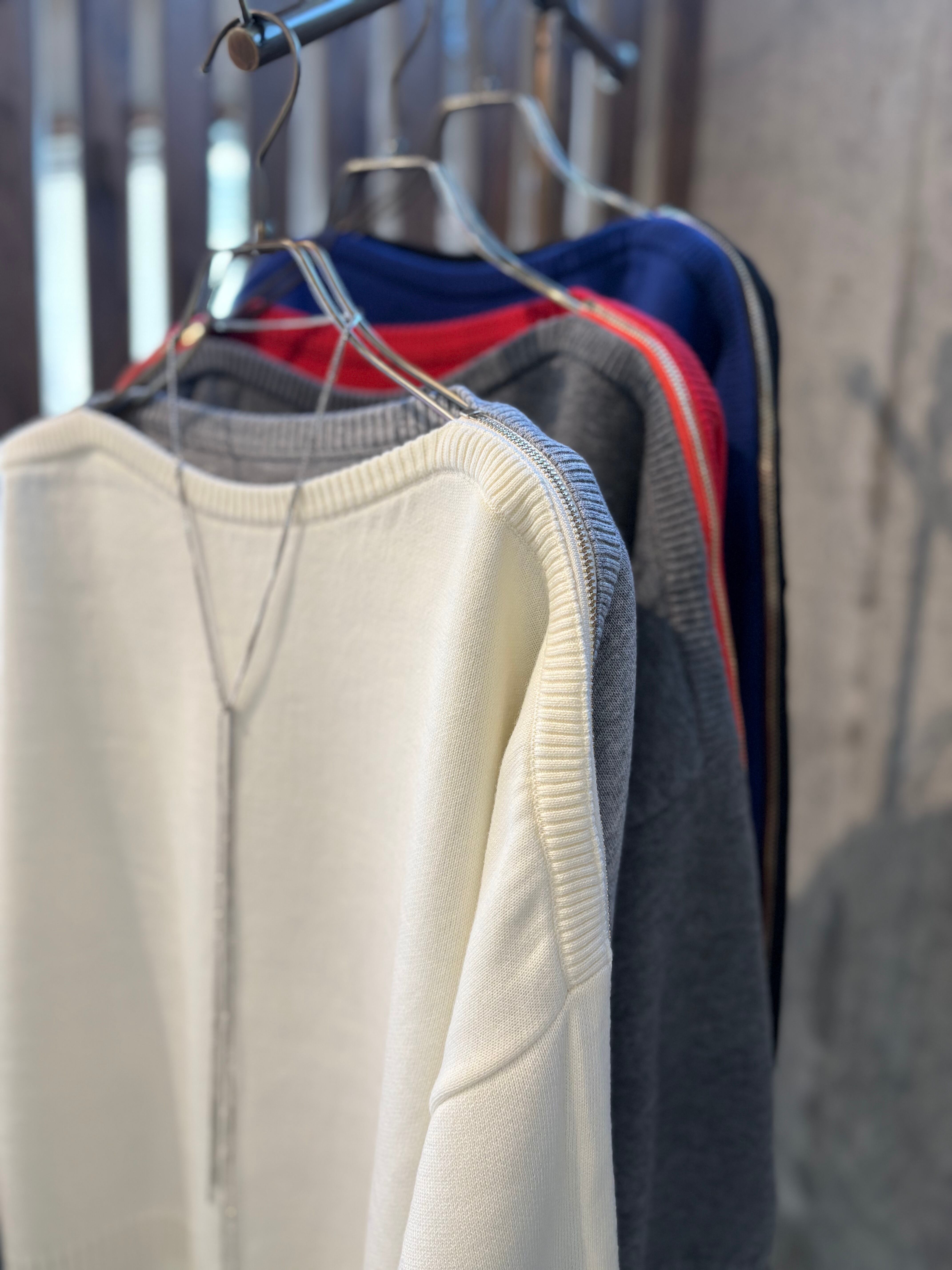 さらっとした毛混の生地を二層に編んだ、軽くて暖かい着心地の接結編みニット。