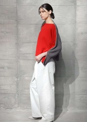 前後をバイカラーで切り替えたデザインは、どちらのカラーを前にするかで印象が一変。気分やボトムに合わせて自由にスタイリング可能。