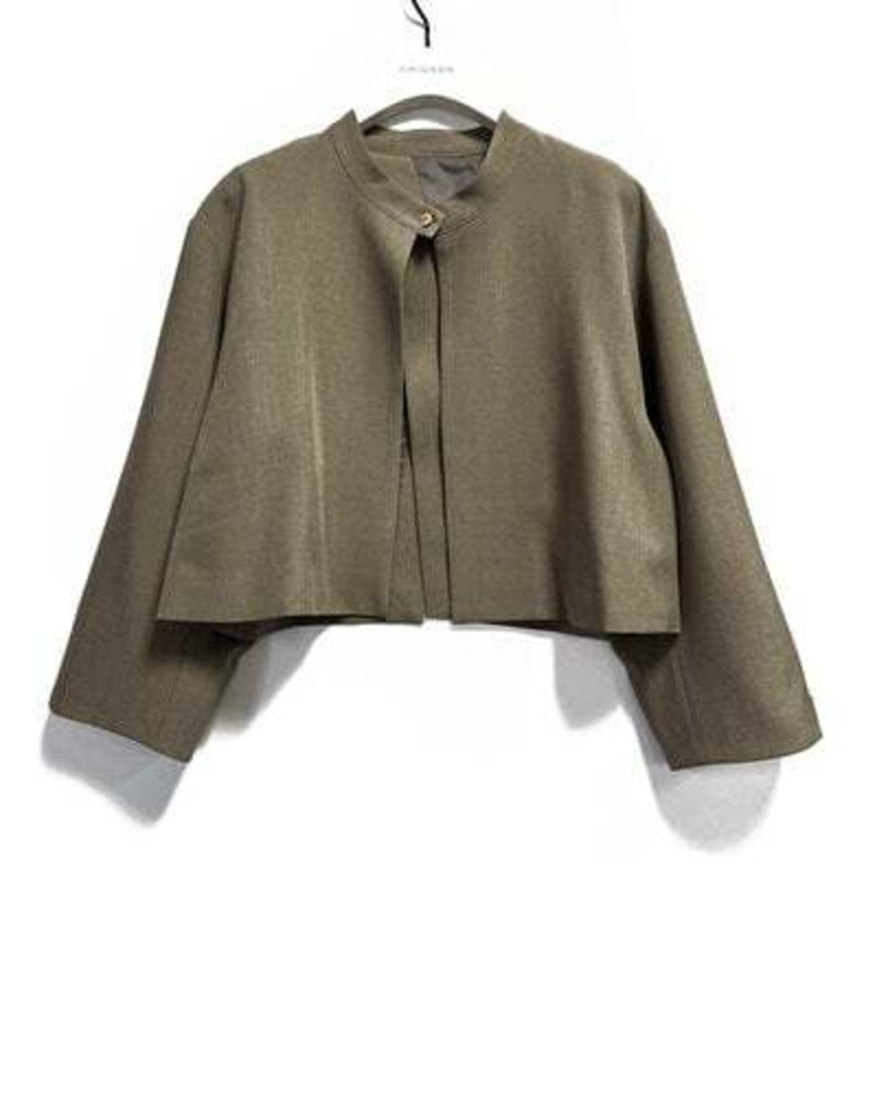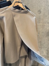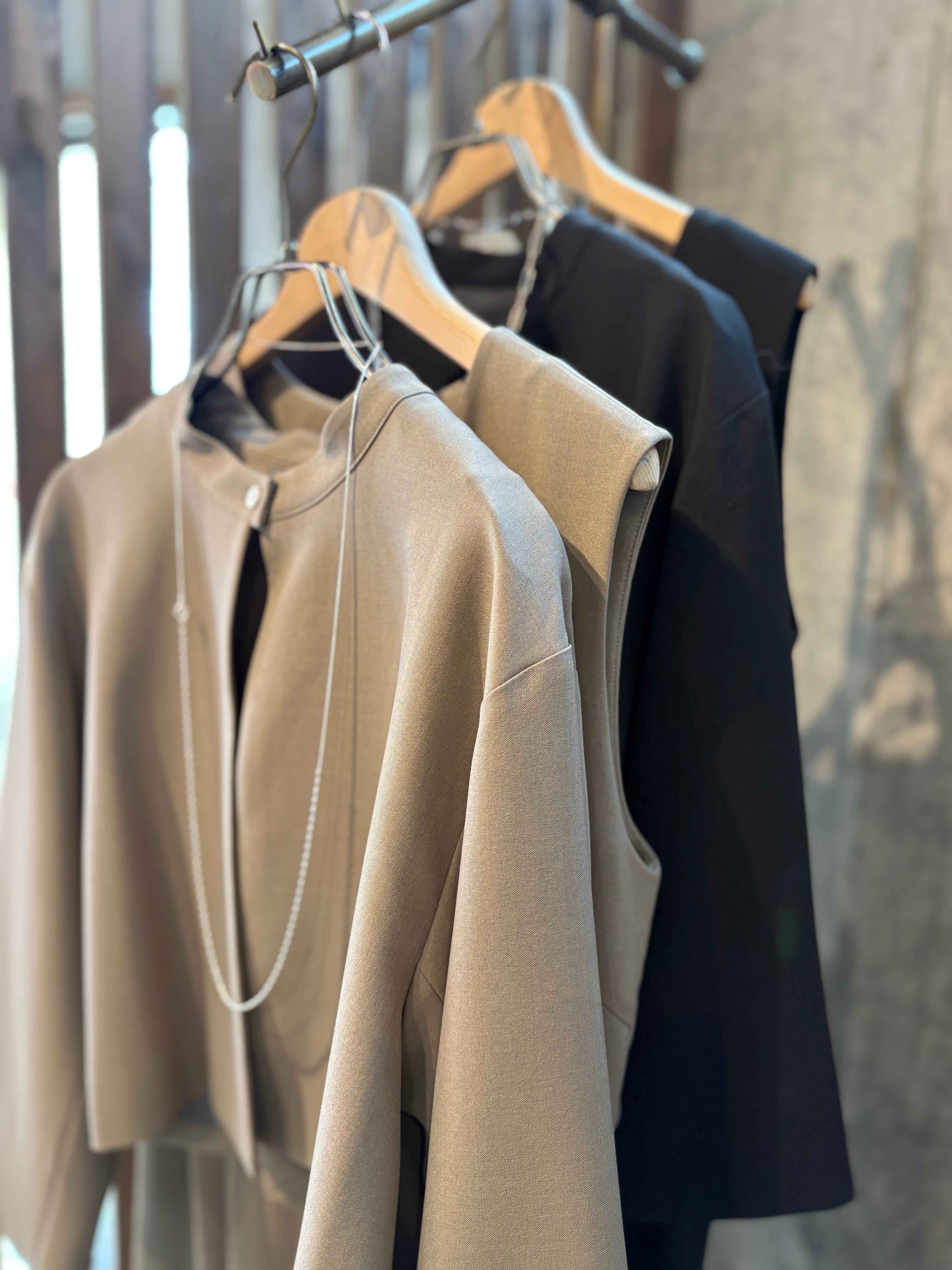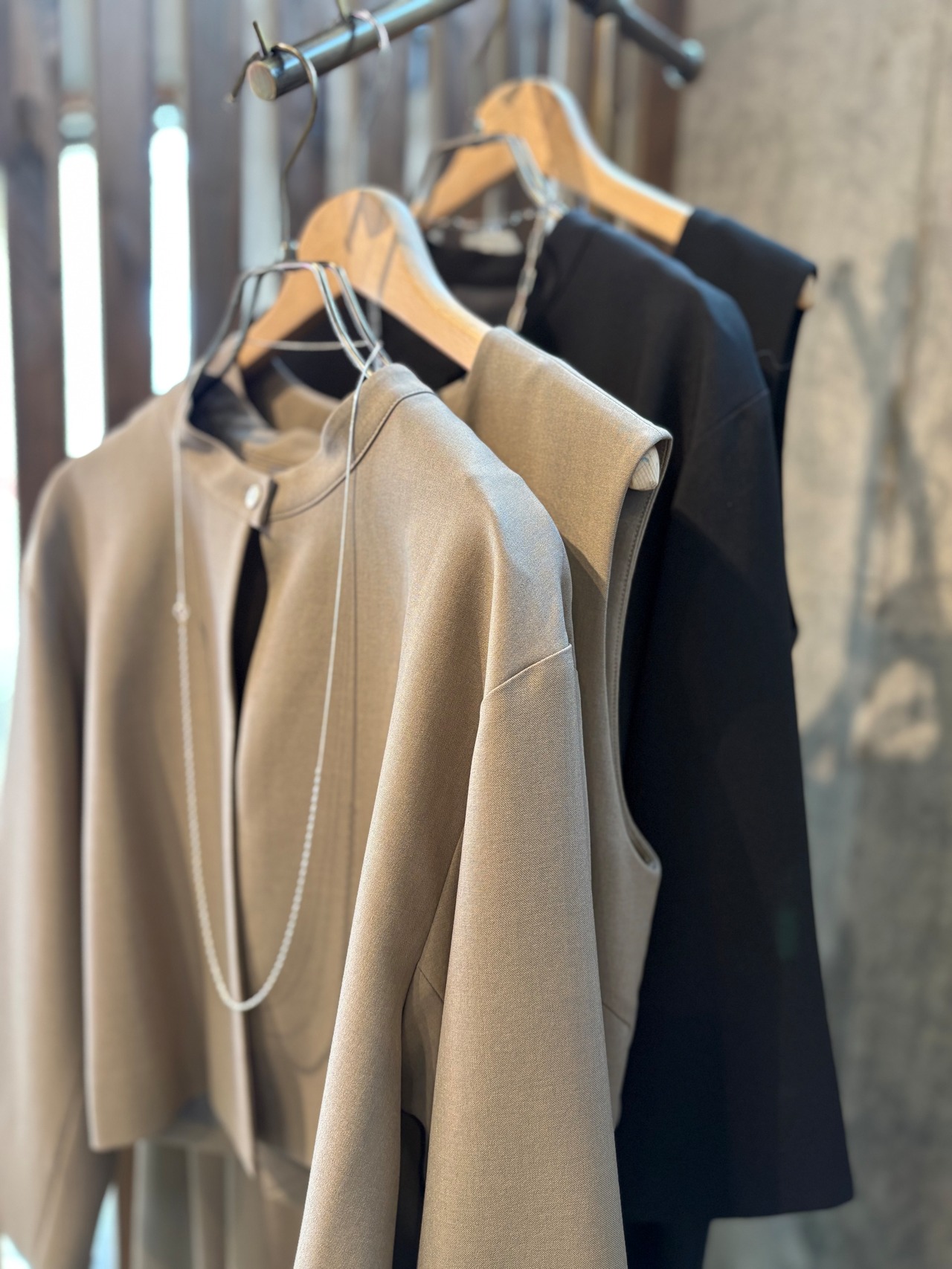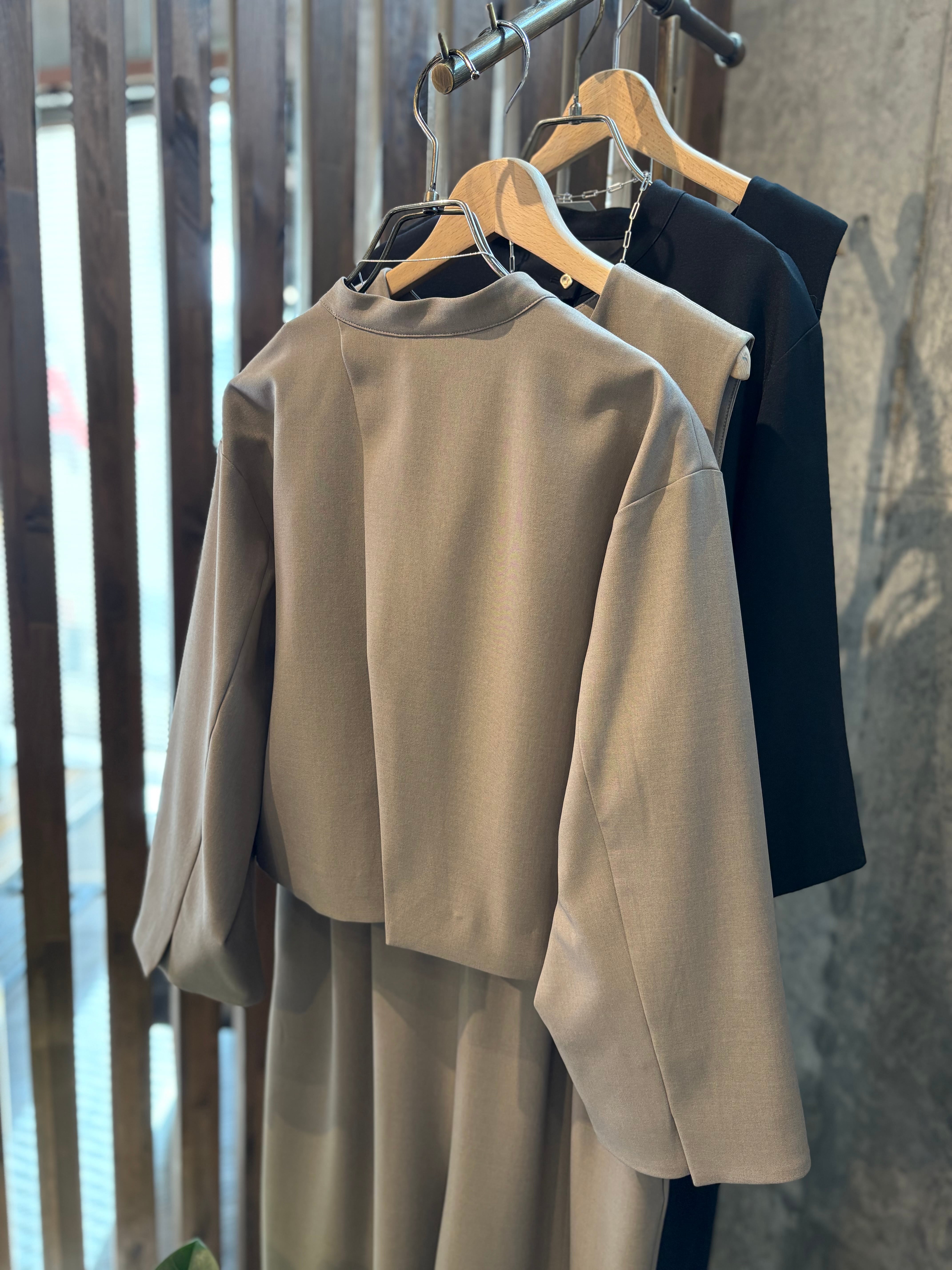 ショート丈のスタンドジャケットはスタンドカラーで少しマニッシュな印象にしつつ、後に大胆にいれたスリットで抜け感をプラス。