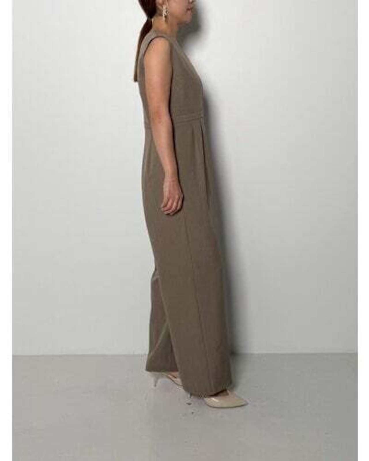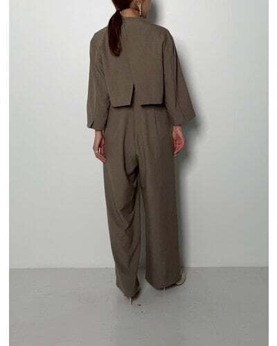 コンビネゾンは少しウエストの切り替えを上側に設定し、ショート丈のジャケットと合わせることでスタイルアップ効果を持たせました。
