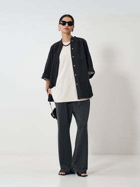 腰まわりはすっきりと、裾にかけてほどよく広がるシルエットが、脚のラインを美しく引き立てます。