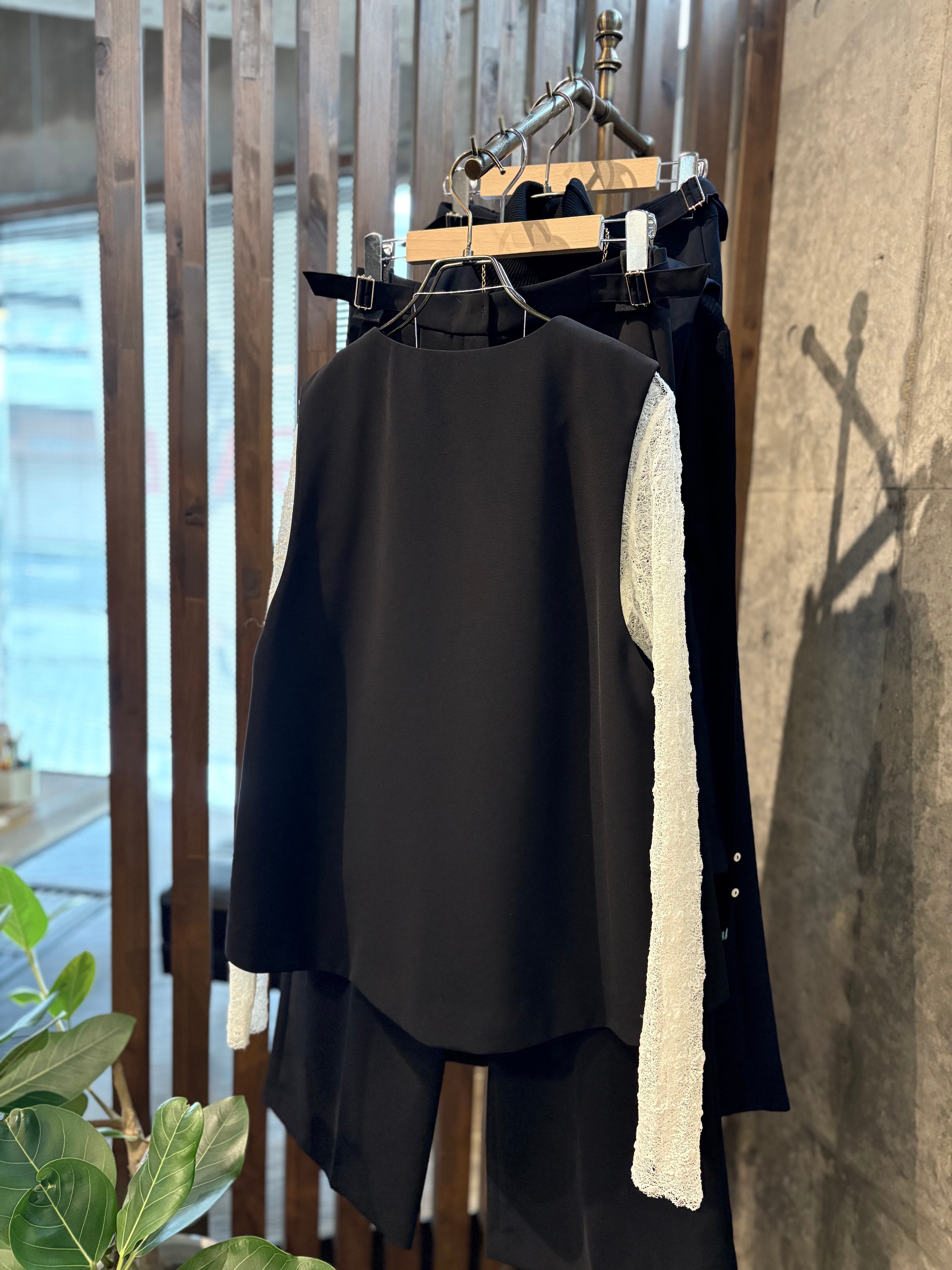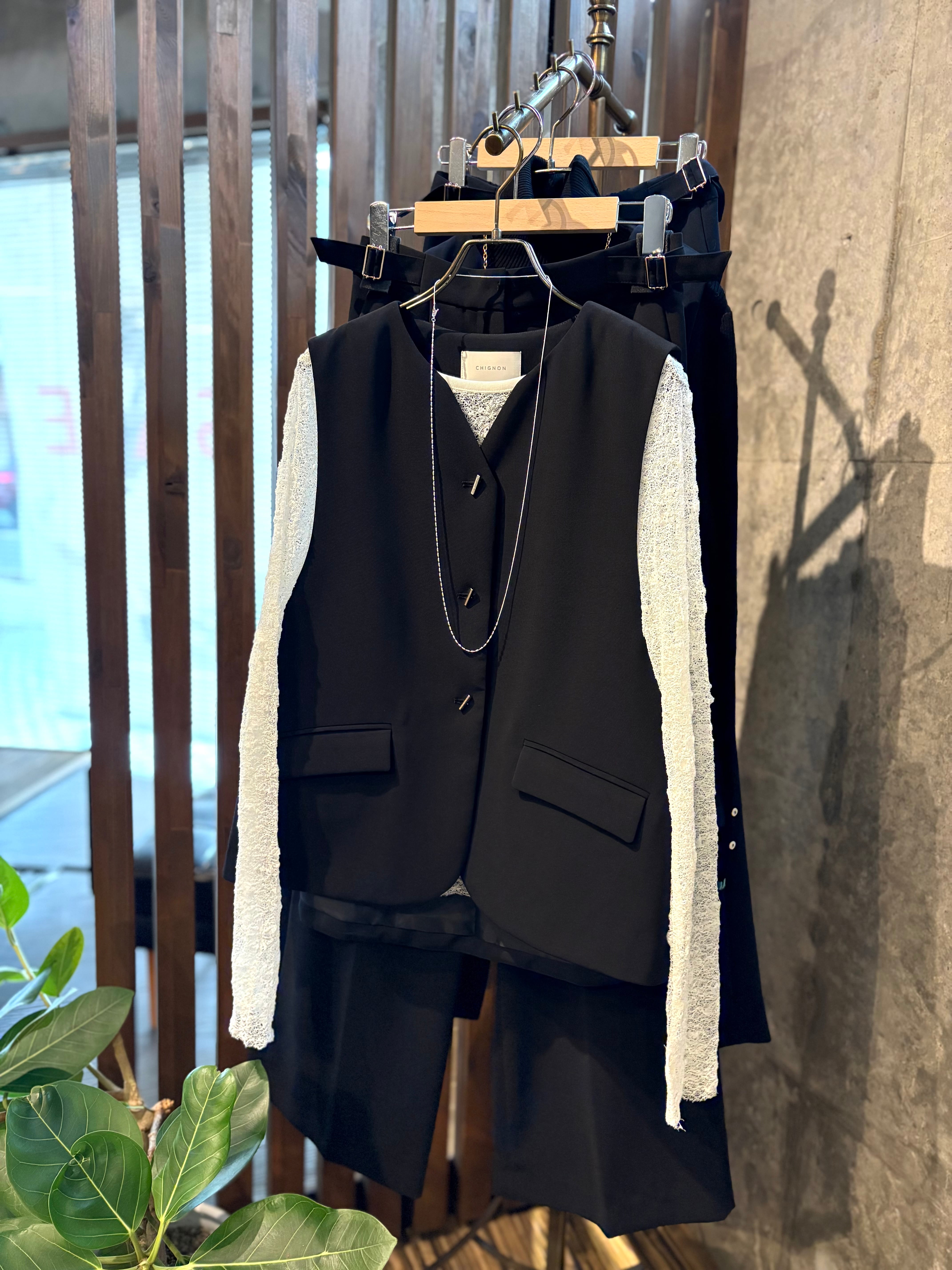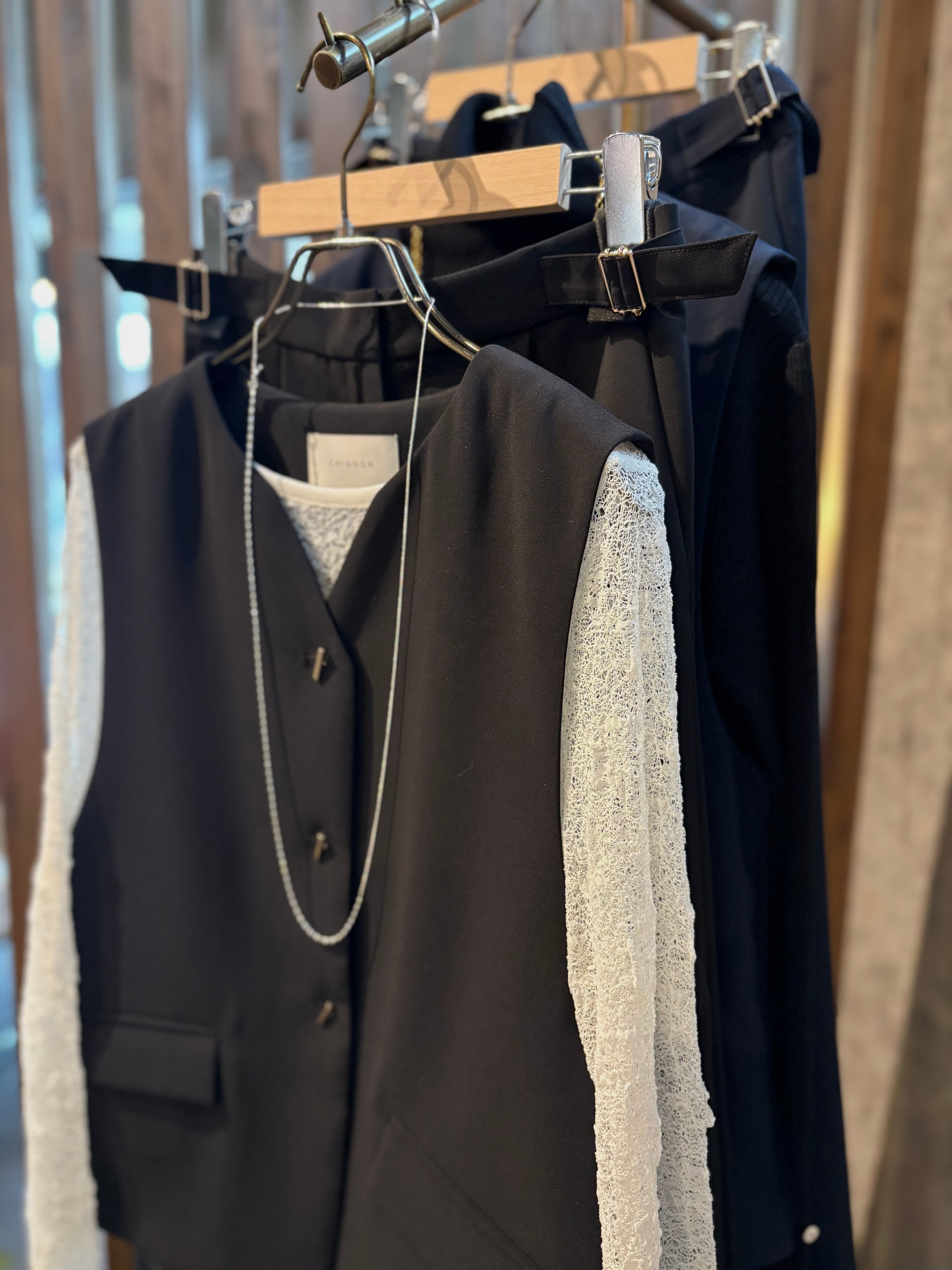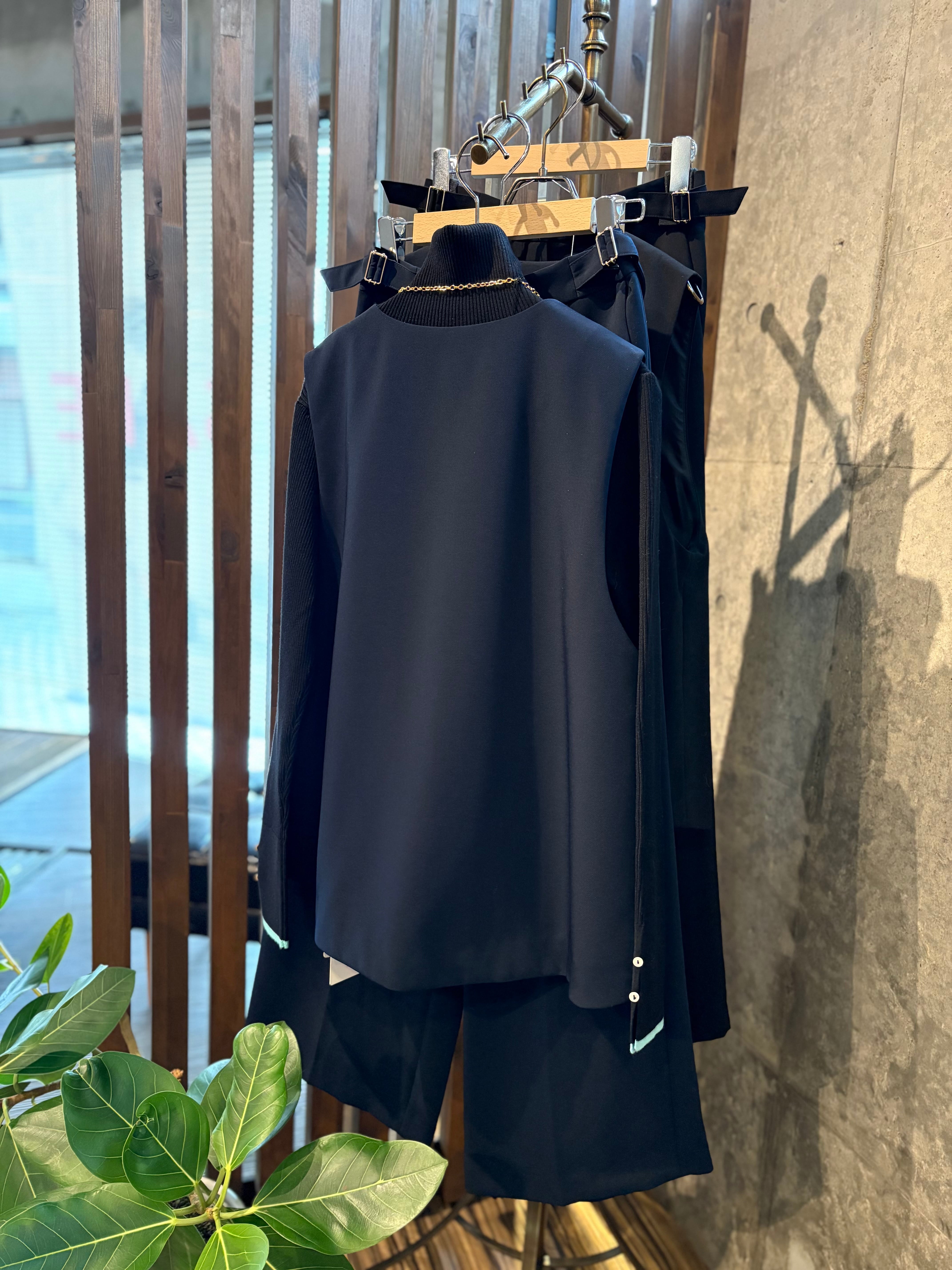 ダブルクロス素材を使用したフレアベスト。