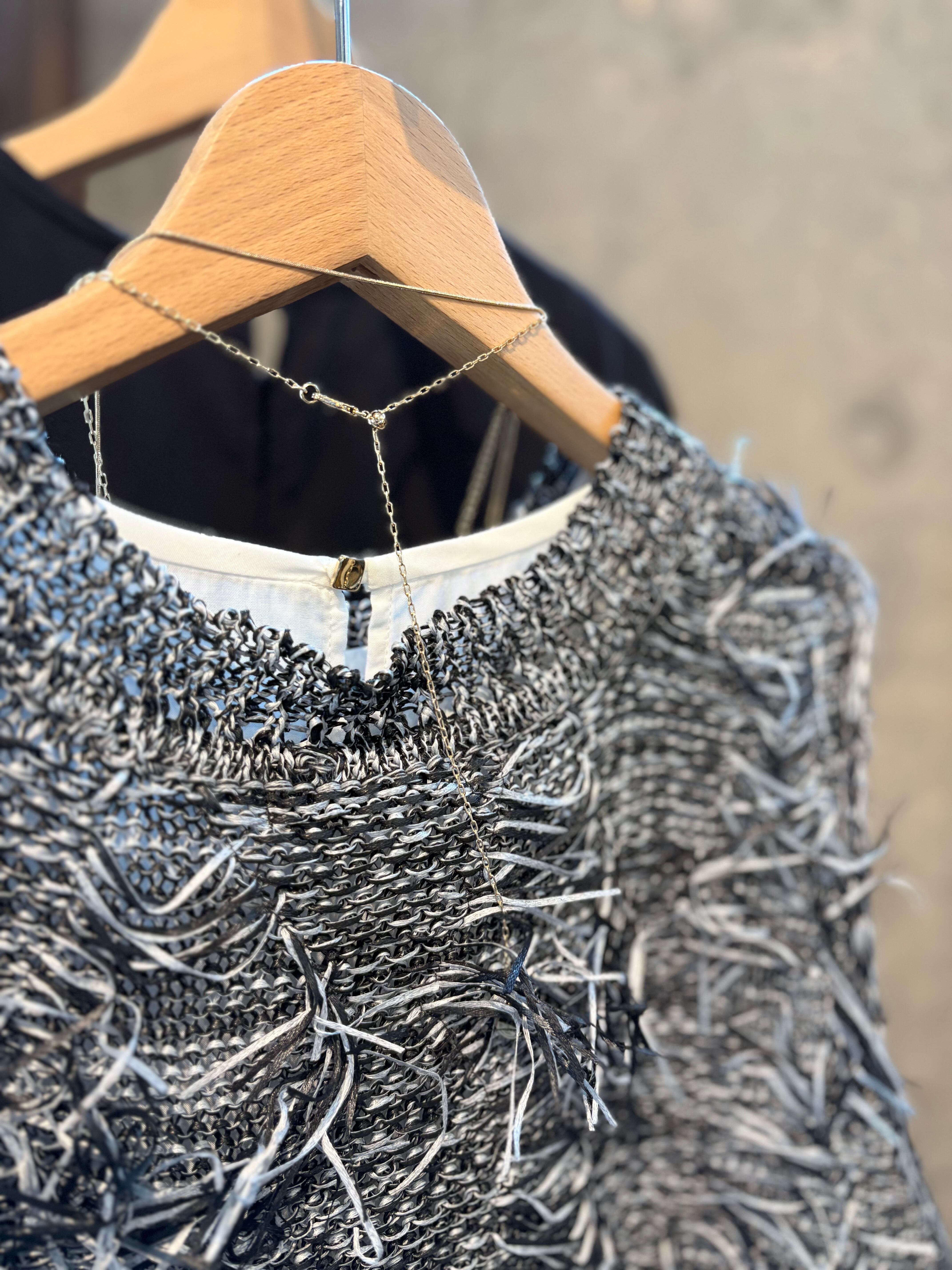 ネック周りはやや浅めのノーカラー仕立てにすることで、