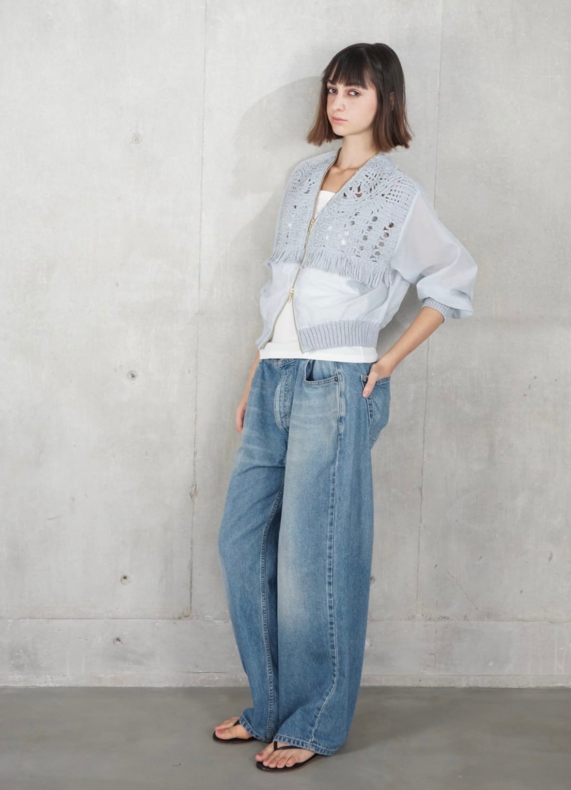 冷房の効いたオフィスでも快適に映え、スッキリとした着丈はワイドパンツやボリュームアイテムとも好相性。デニムを合わせるだけで、抜け感のある大人のスタイルが完成します。
