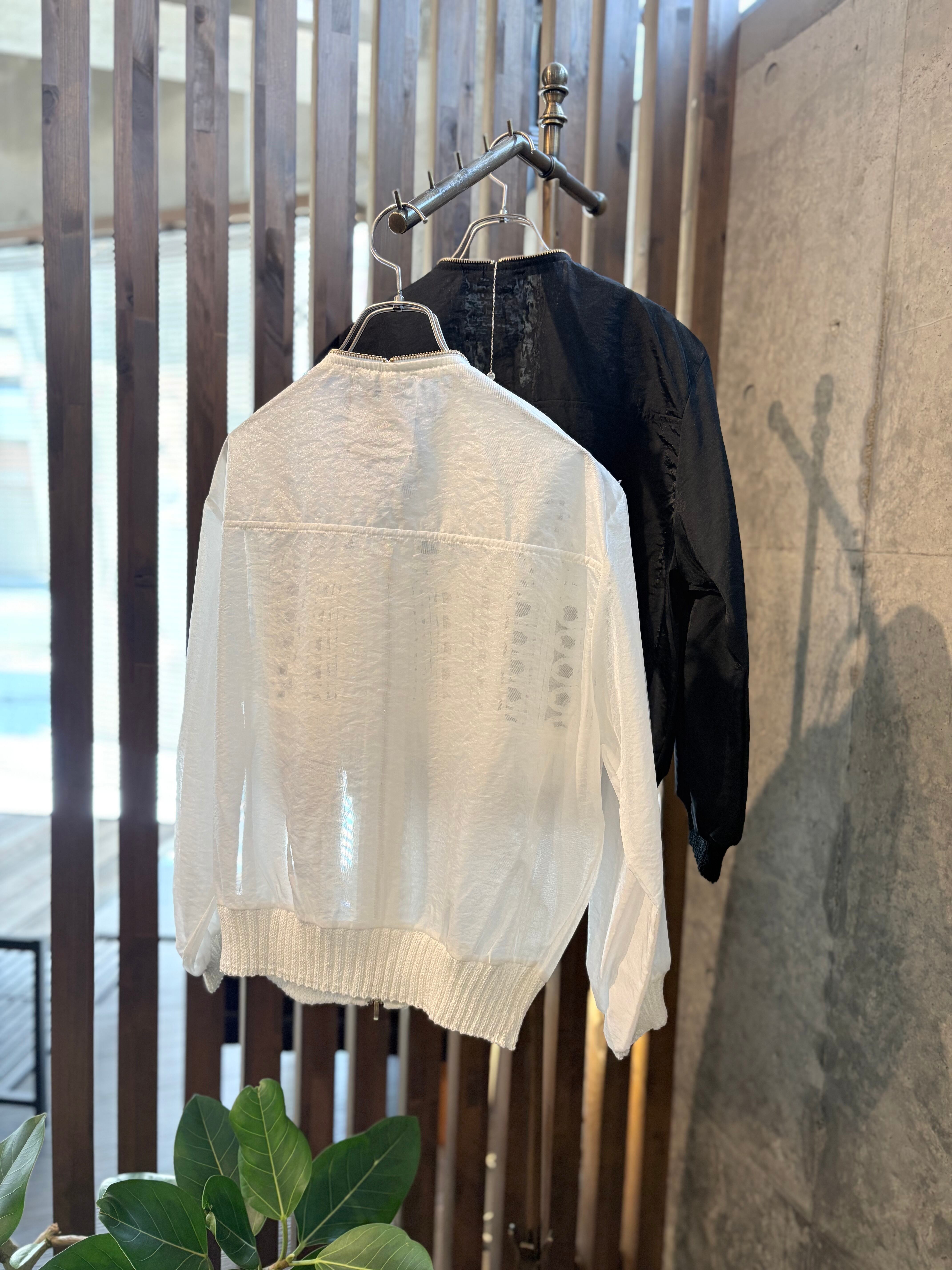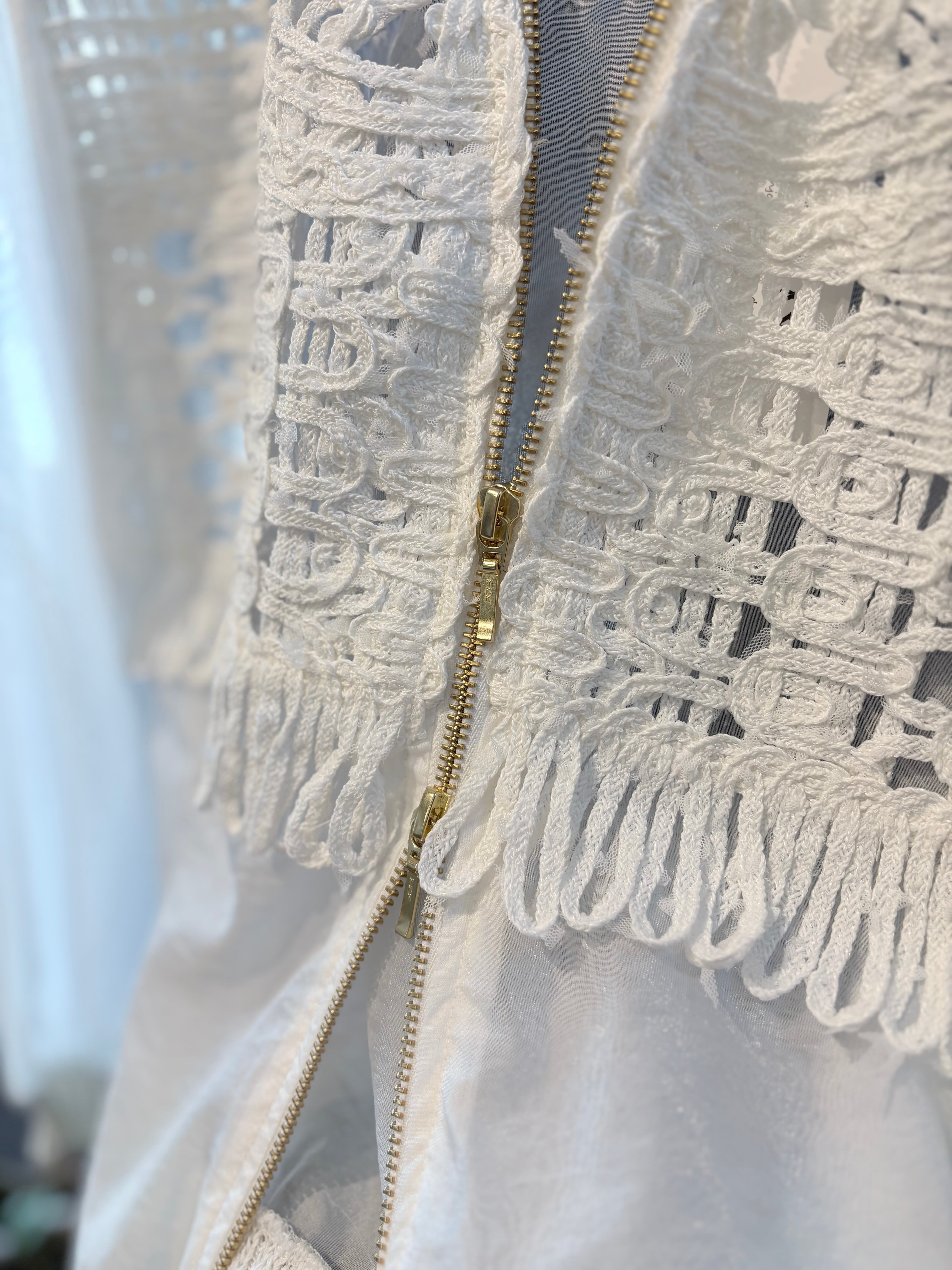 胸元のコード刺繍と柔らかに光を纏うオーガンジーが程よい甘さを演出し、ジップのシャープなラインが全体を引き締めることで、羽織るだけで洗練された存在感を放ちます。