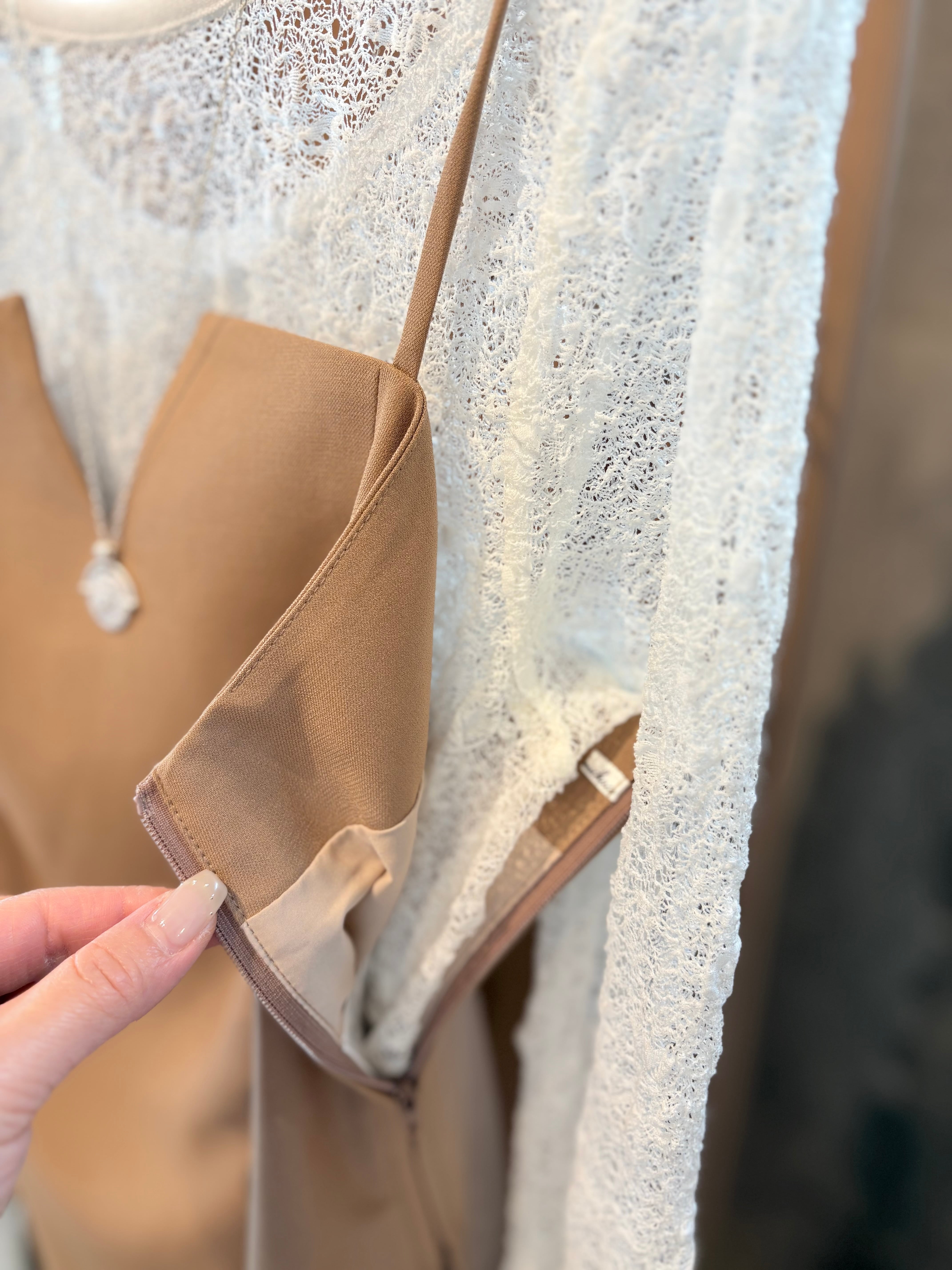 調節可能なストラップが快適なフィット感を提供し、上品なデコルテラインを引き立てるデザインが特徴です。
