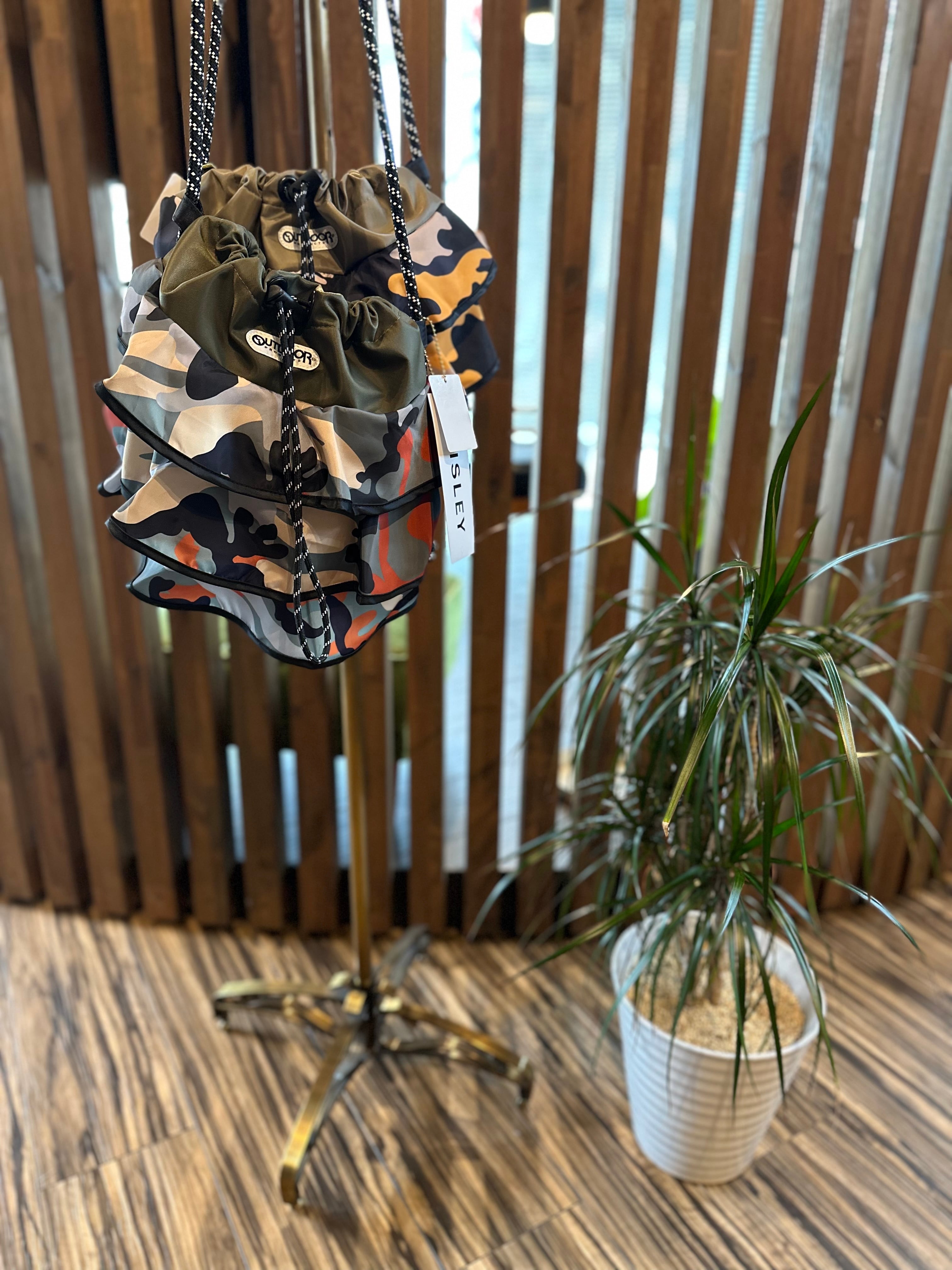 フリルのティアードデザインに迷彩柄のミックスが目を引くデザイン。