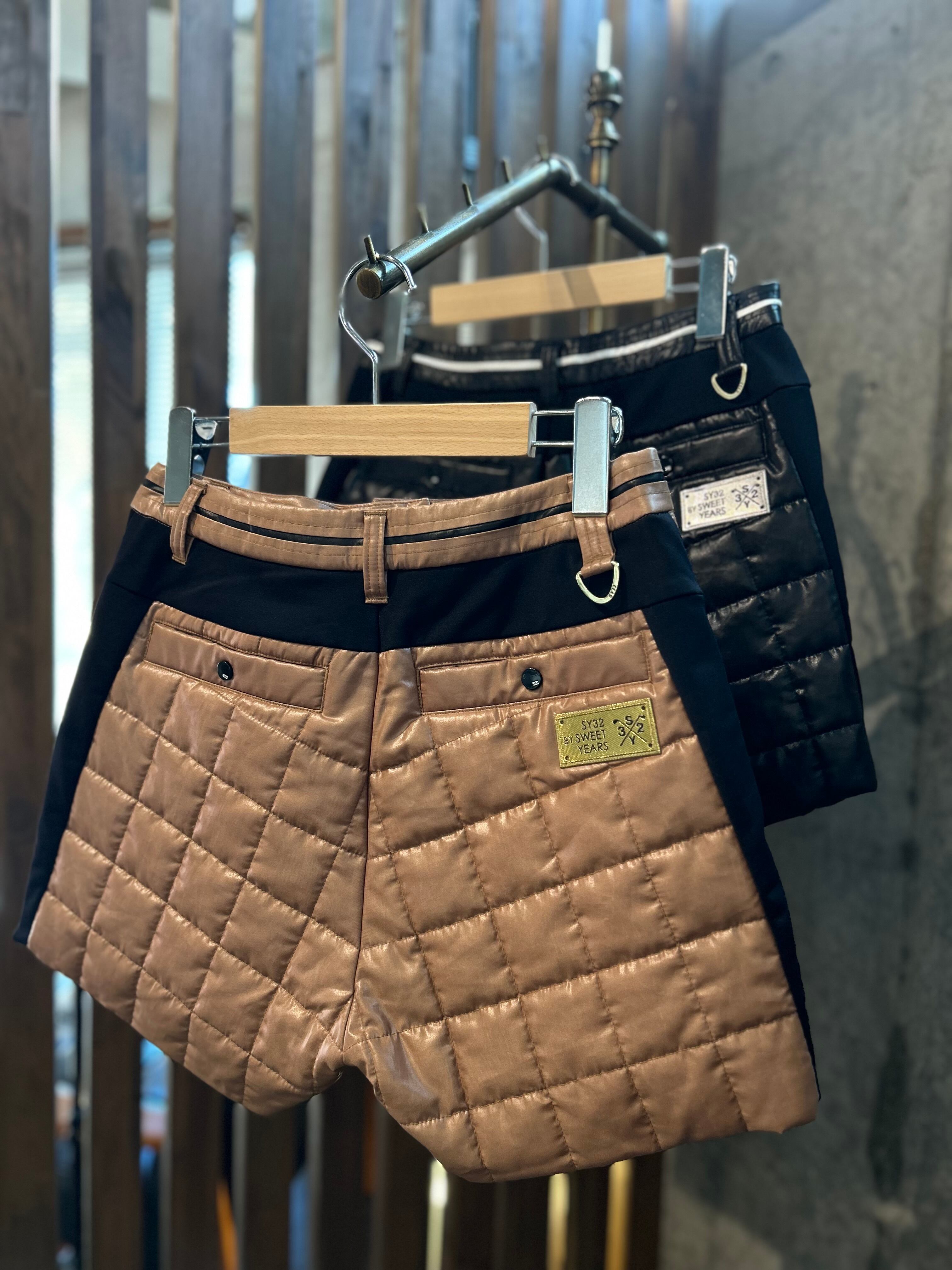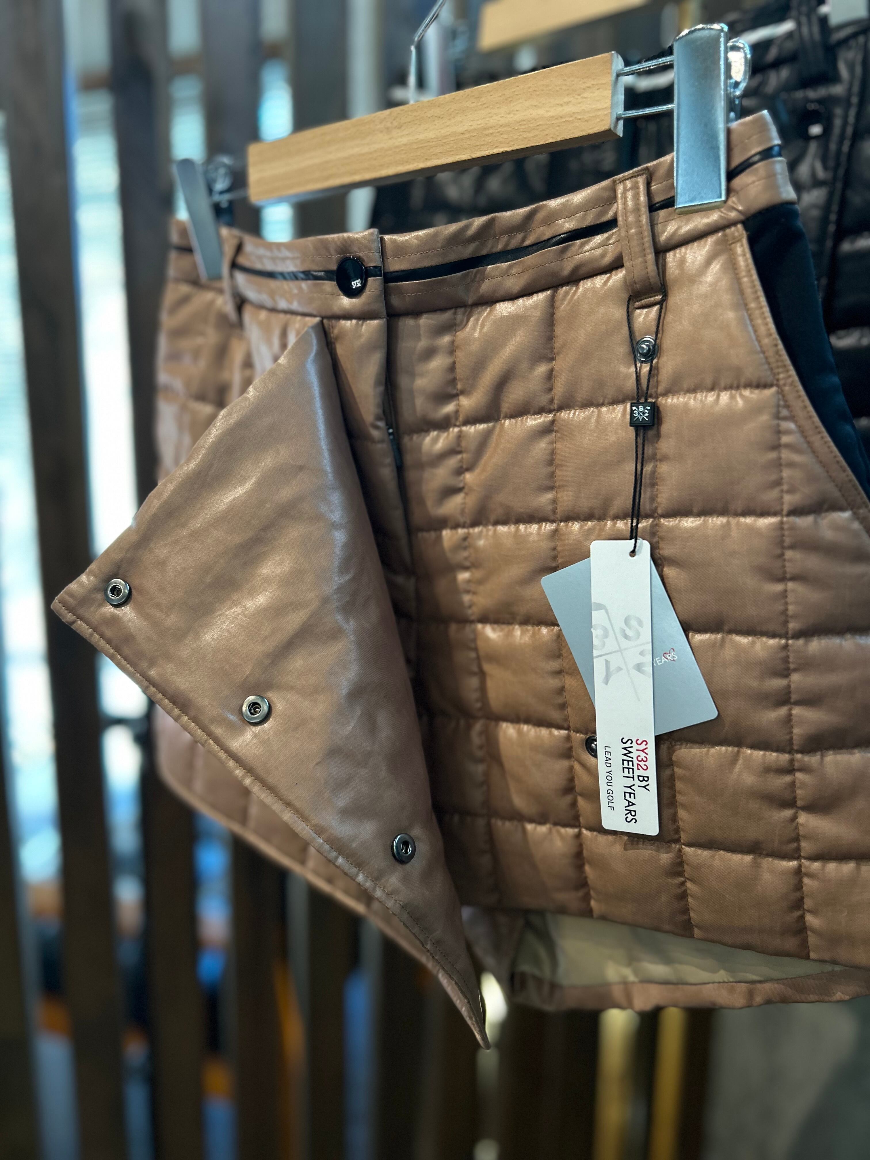 ウェットで艶っぽい光沢感のヴィンテージレザー調ポリエステル素材を使用したキルティングキュロットスカート。