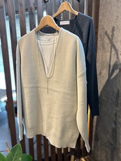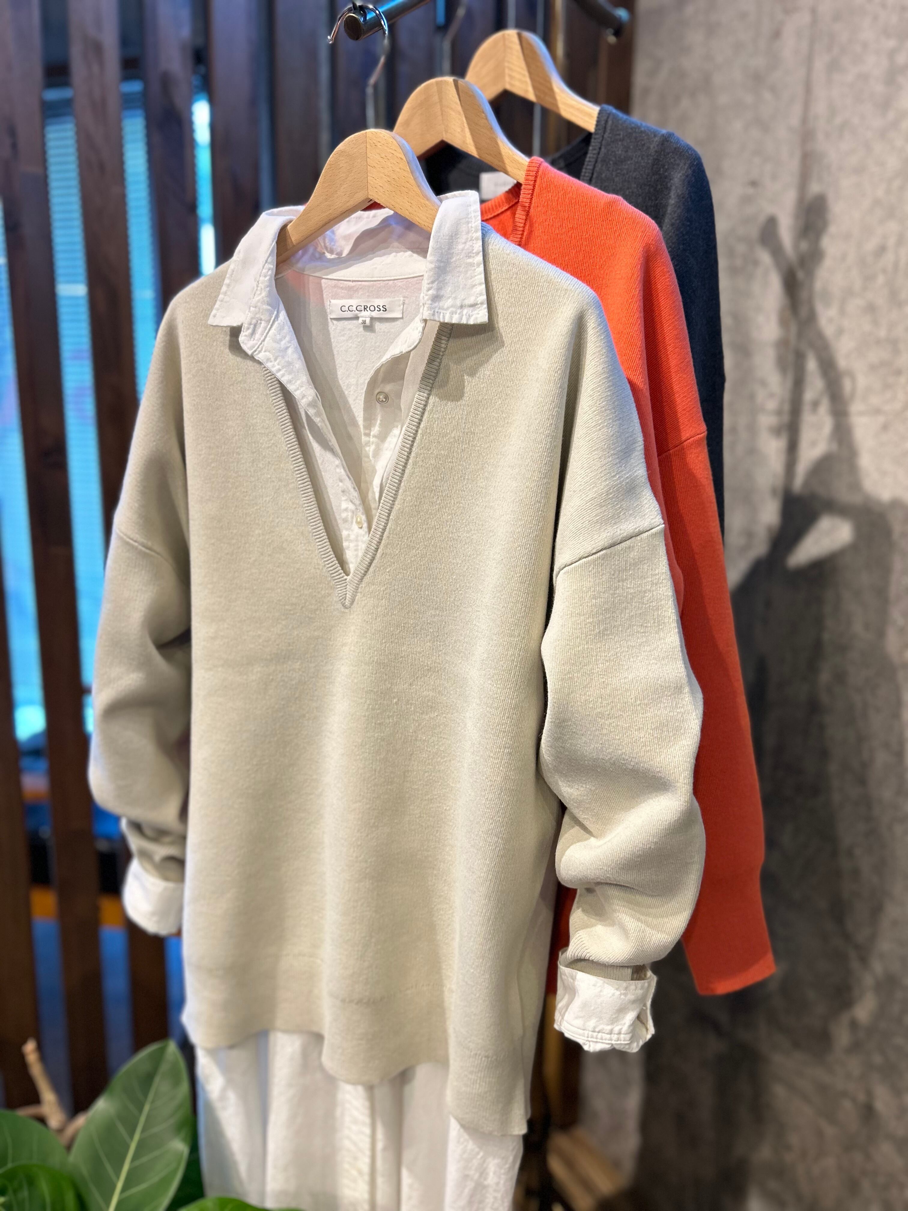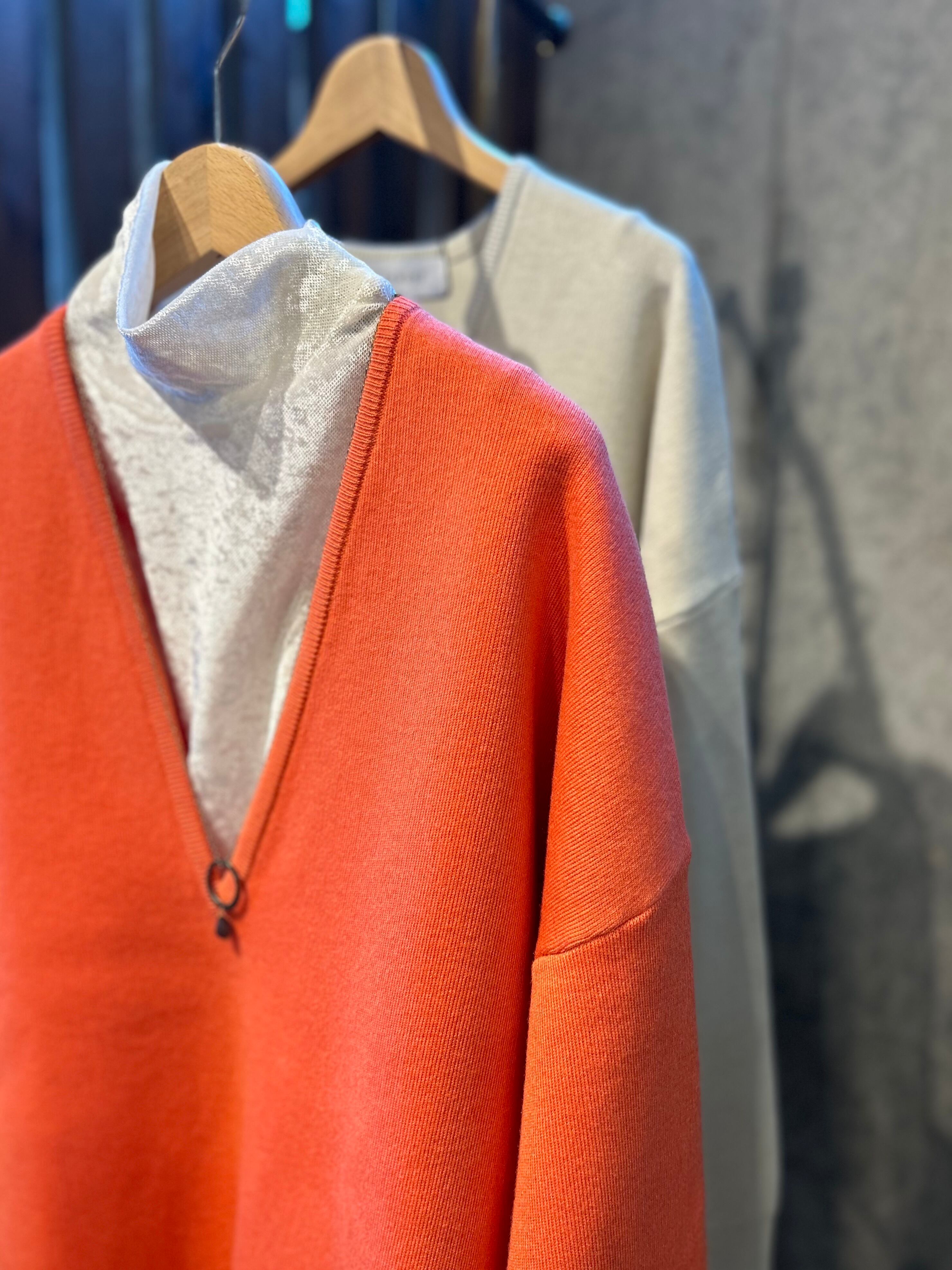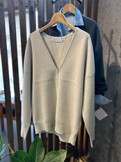 ざっくりと開いたVネックが特徴的な、オーバーニットの登場です。