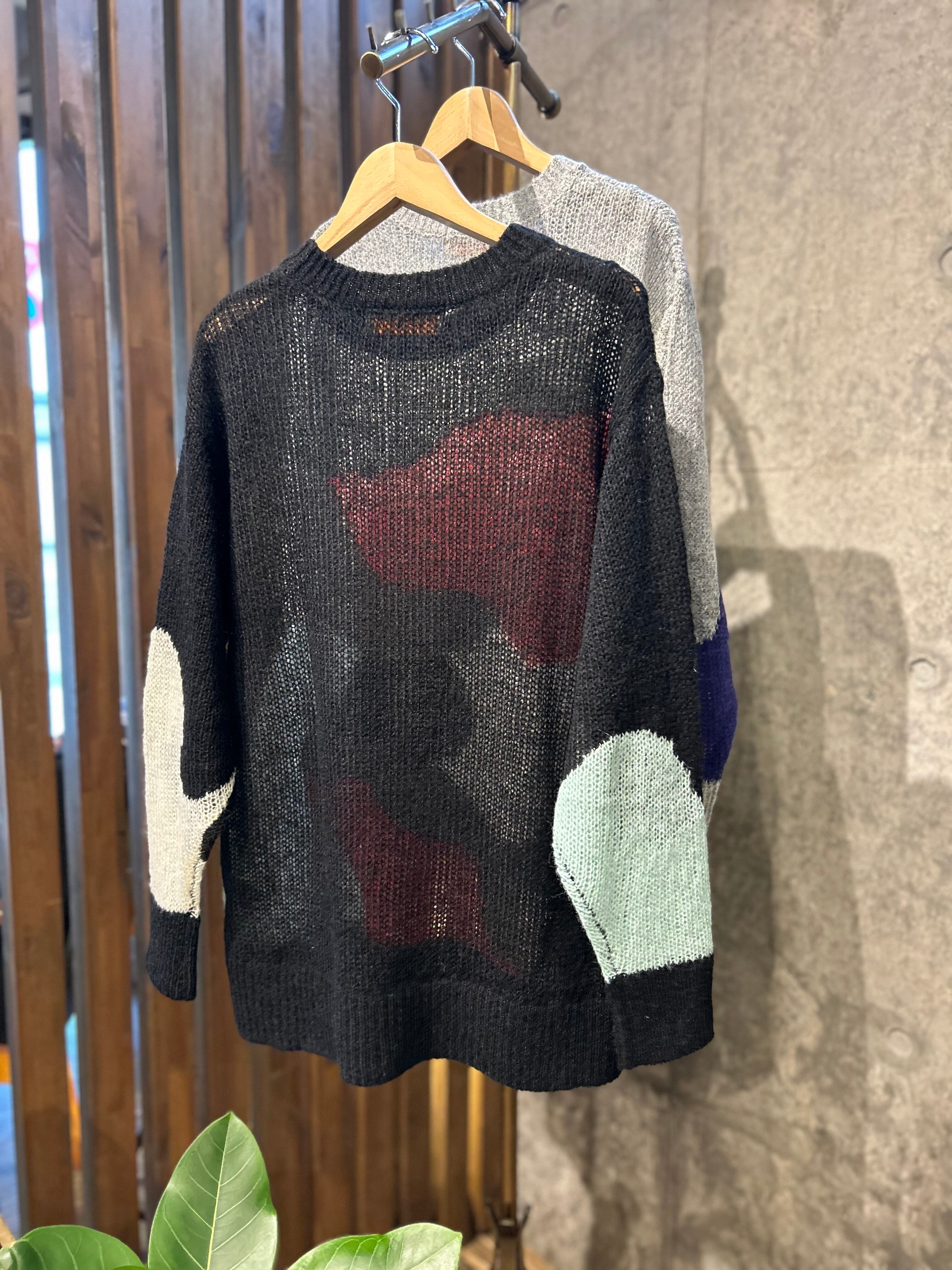 モヘアタッチの糸をローゲージに編んだ、透け感のあるニット。