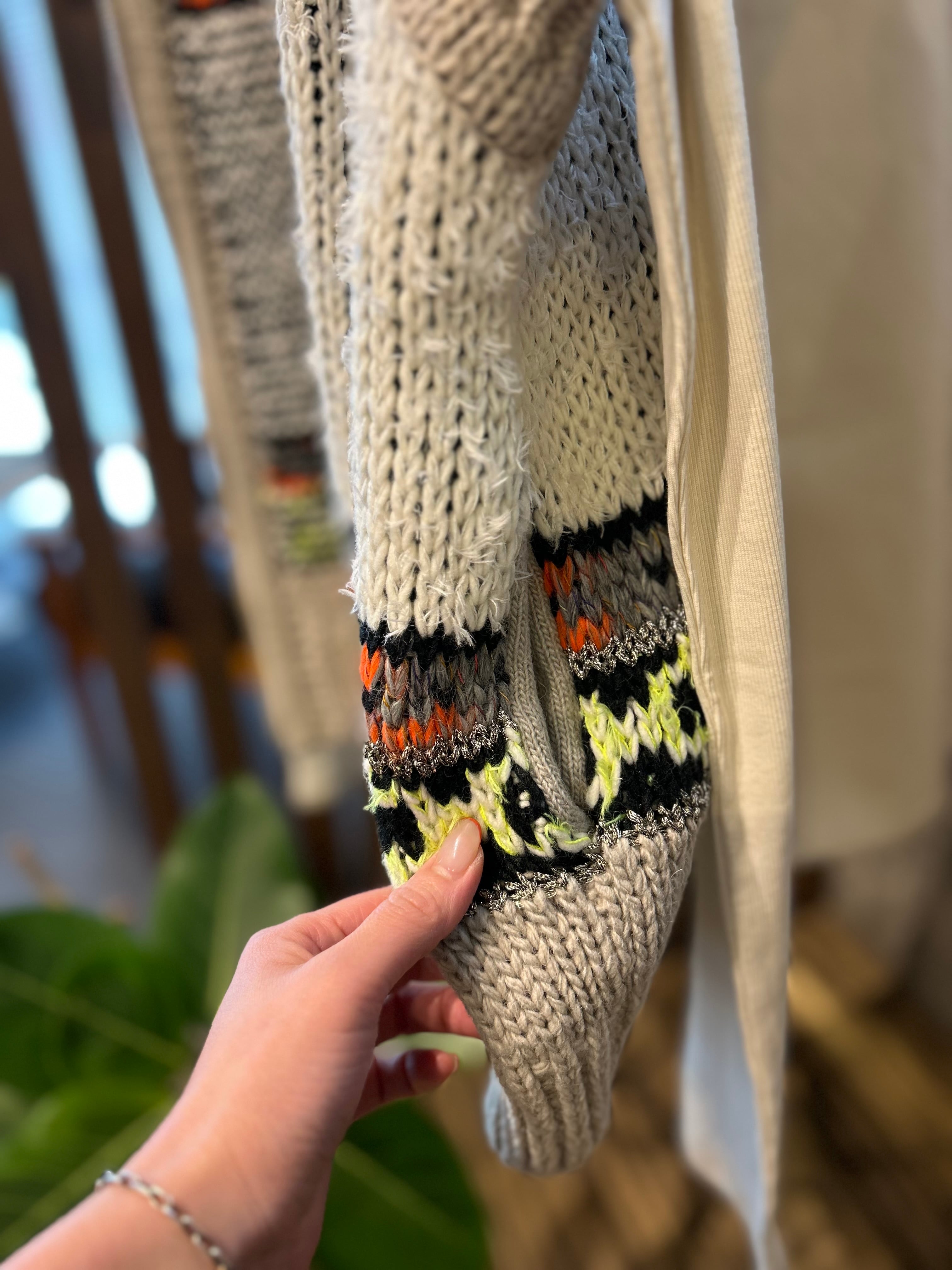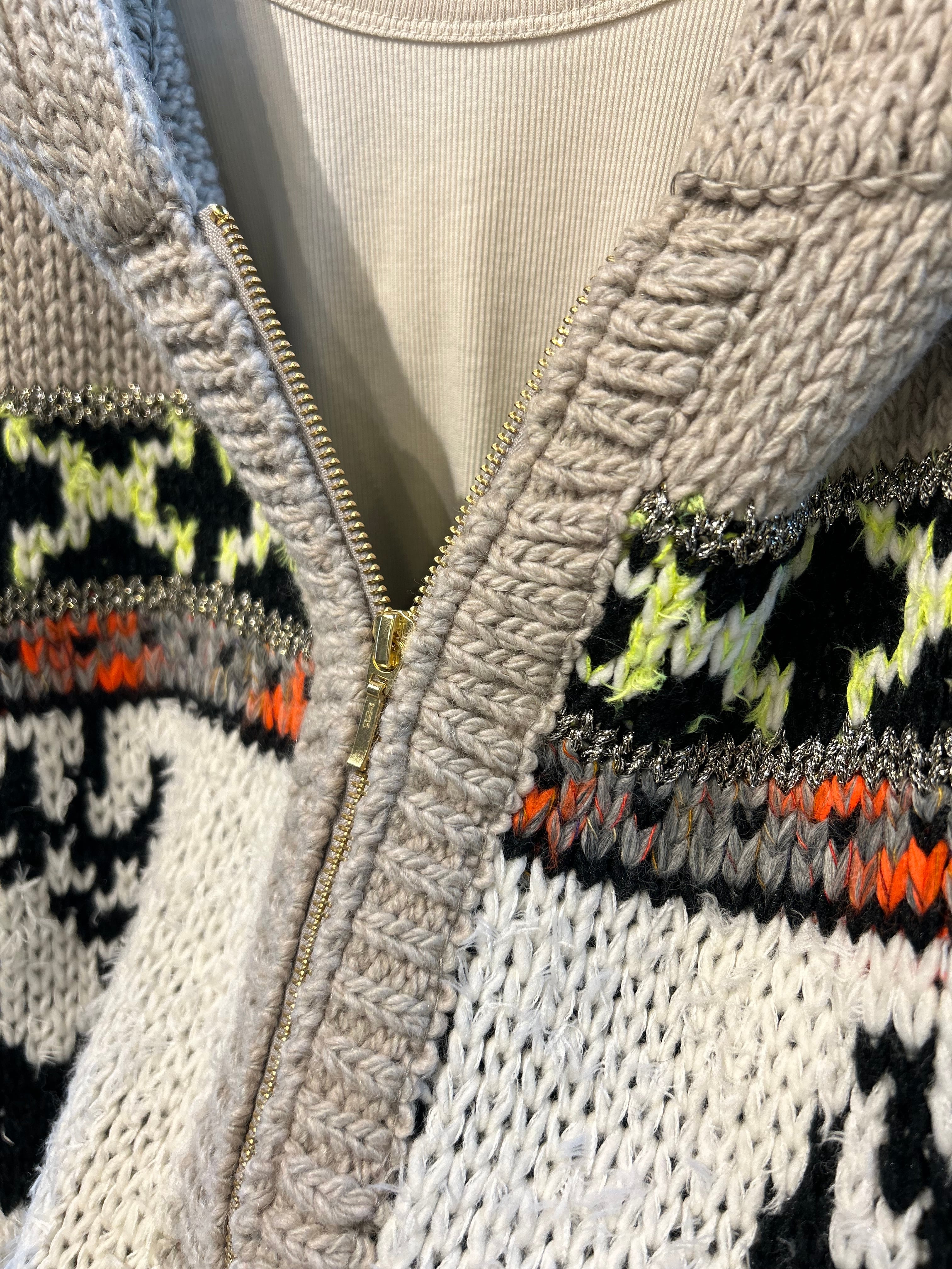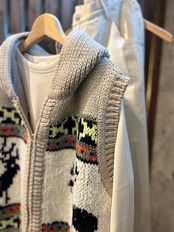 ところどころに入った蛍光色と、跳ねるように顔を出すオリジナルシャギーヤーンが、伝統的なカウチン柄を個性的なデザインへとアップデート。