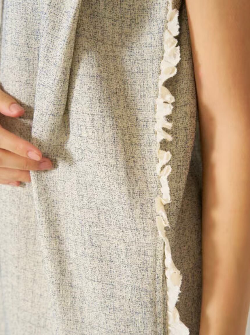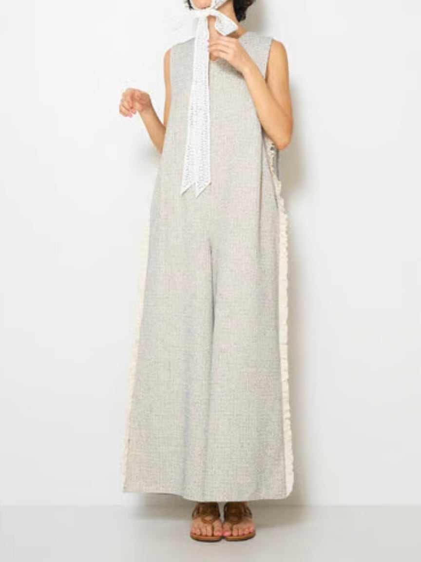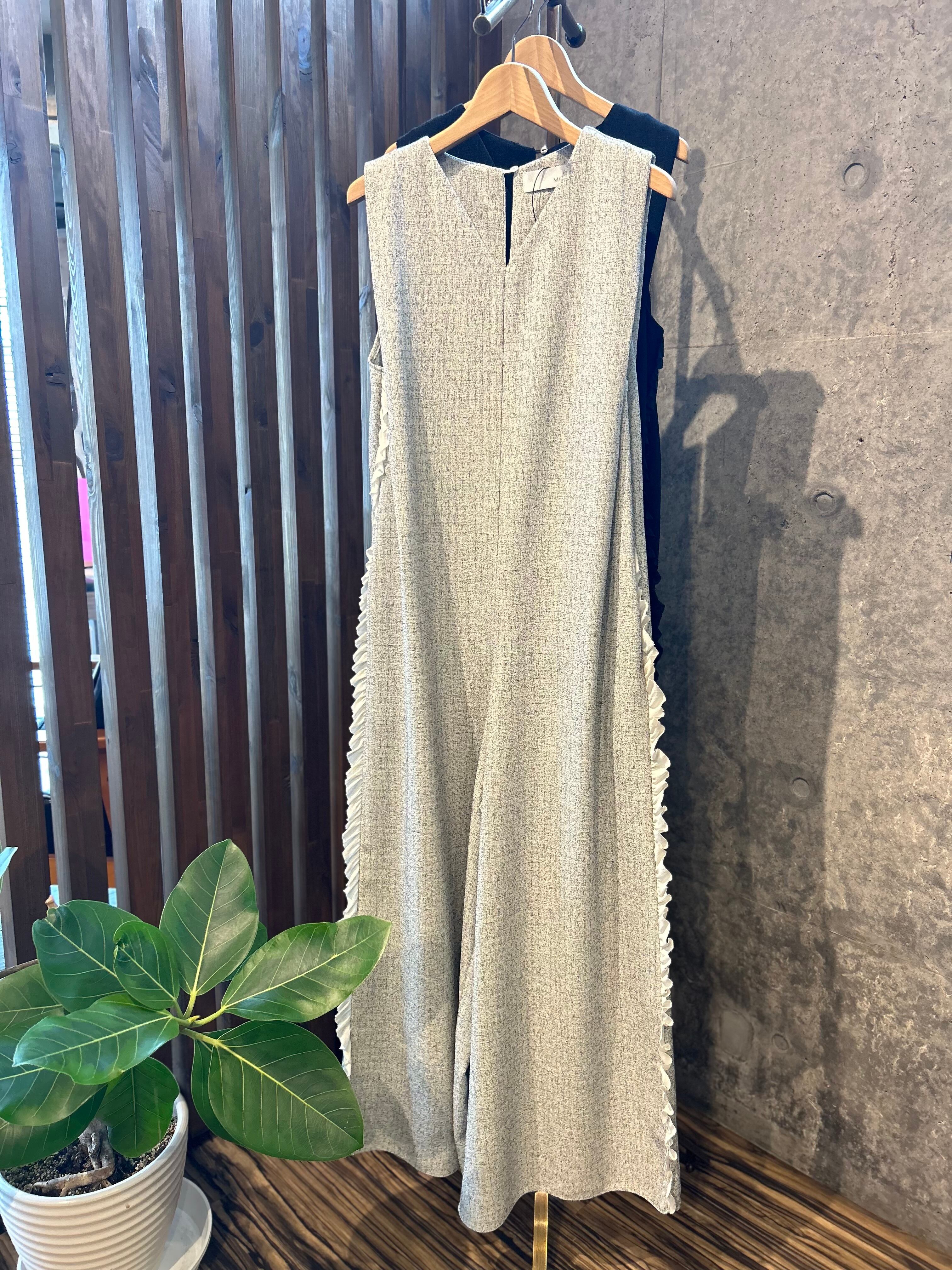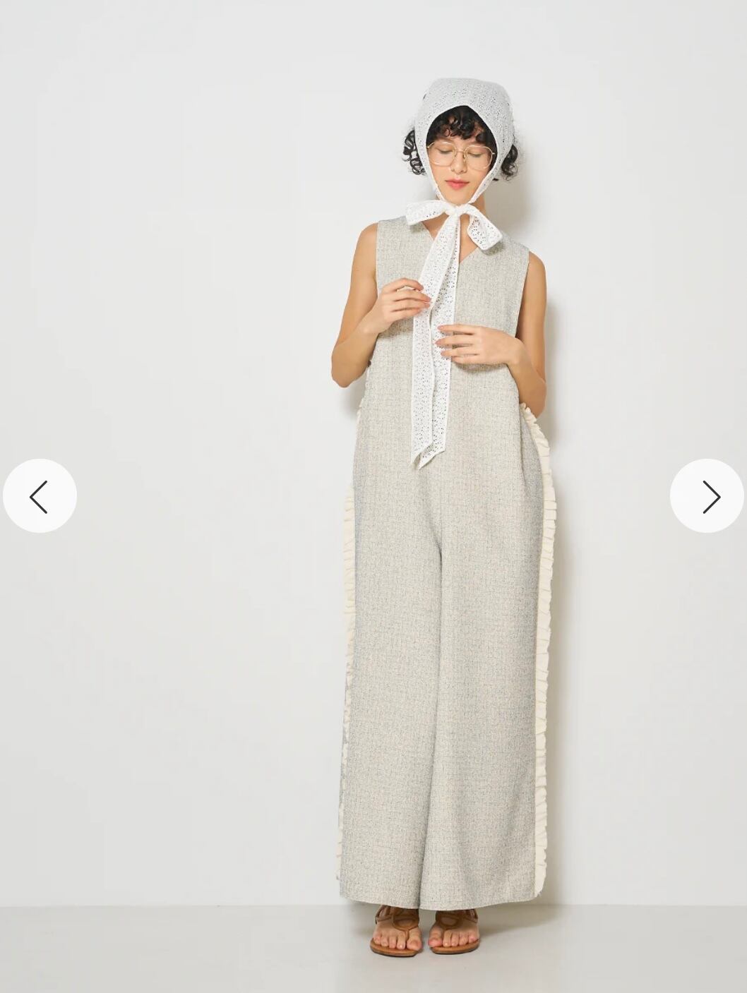 フリル付きツイードオールインワンです。春にピッタリなツイード素材を使い、別布で作った細かい断ち切りフリルを両サイドに挟み込みました。一枚で着やすい衿ぐりと、体のラインを拾わないワイドシルエット。インに薄手のカットソーやシャツを着て、早い時期から春ツイードを楽しんで頂けます。