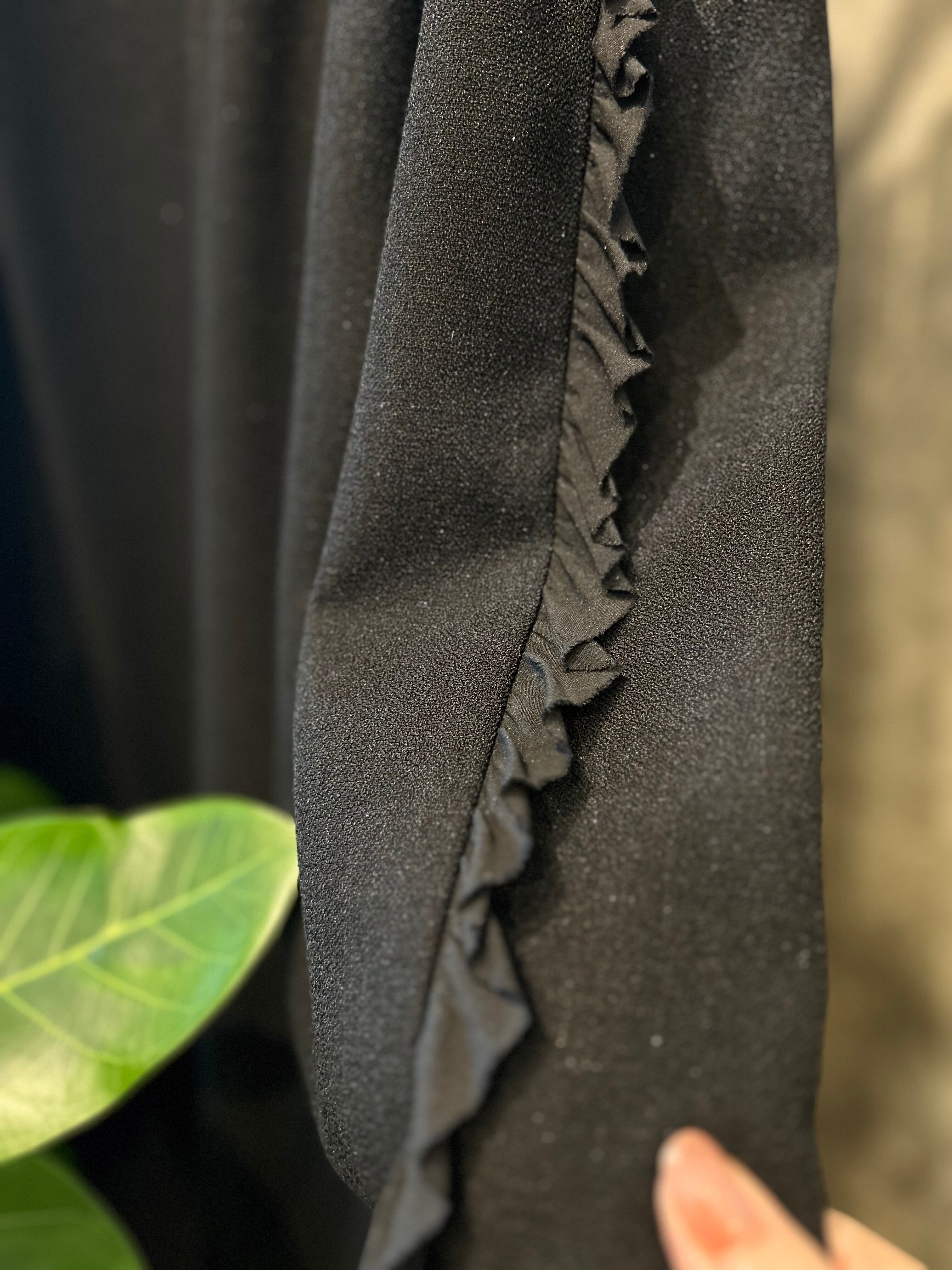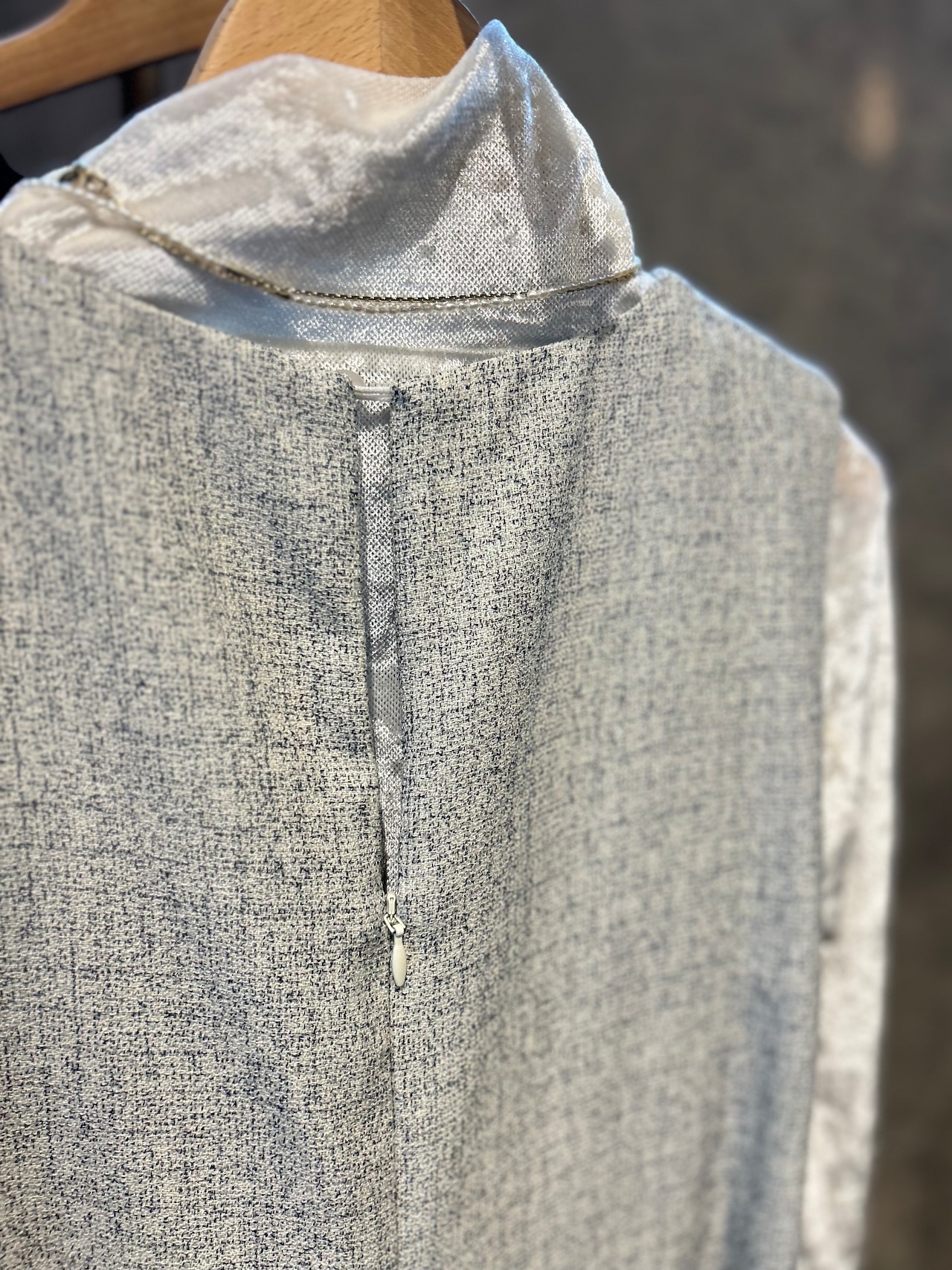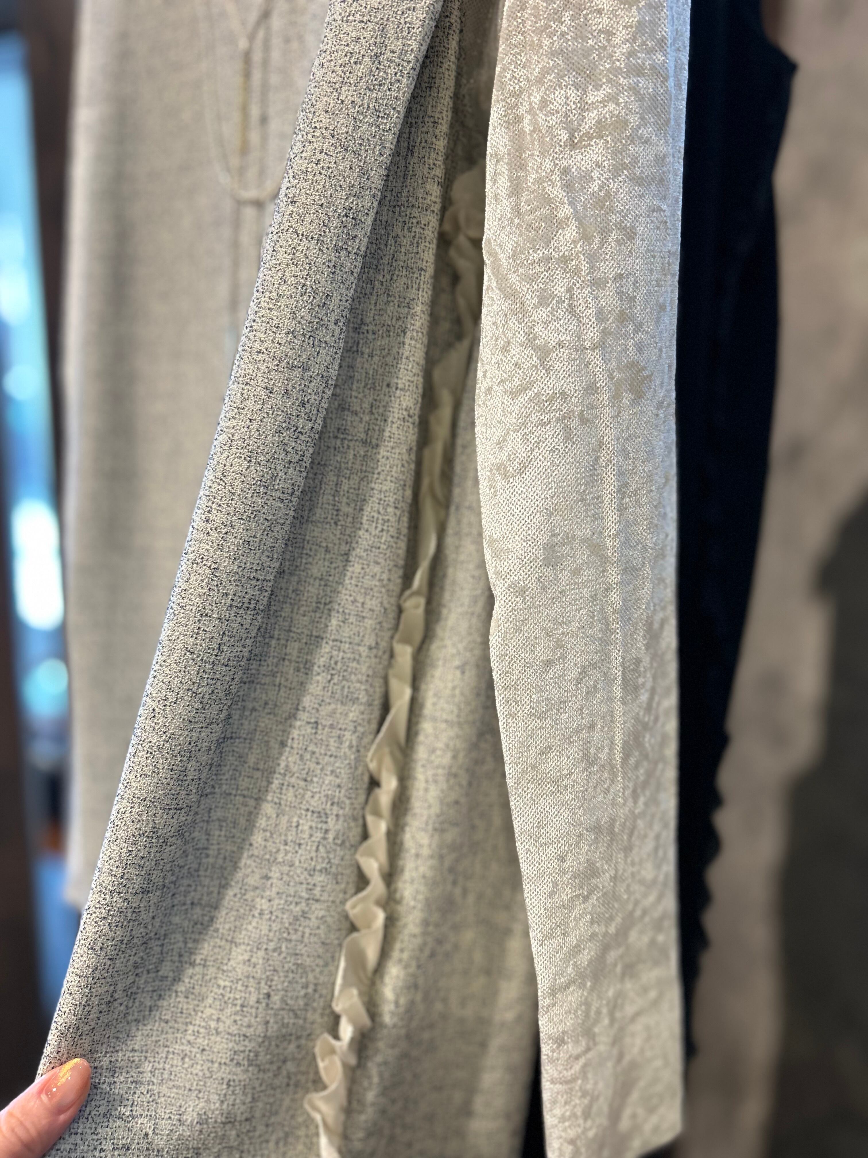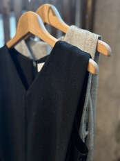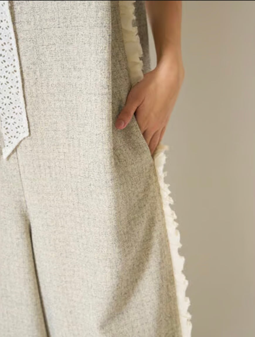 フリル付きツイードオールインワンです。春にピッタリなツイード素材を使い、別布で作った細かい断ち切りフリルを両サイドに挟み込みました。一枚で着やすい衿ぐりと、体のラインを拾わないワイドシルエット。インに薄手のカットソーやシャツを着て、早い時期から春ツイードを楽しんで頂けます。